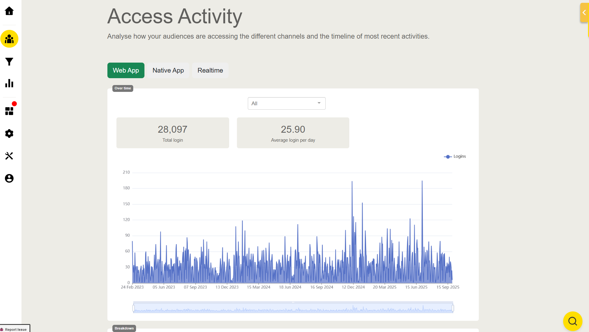 This page provides insights into how your audience is interacting with the web app and the timeline of their most recent activities.