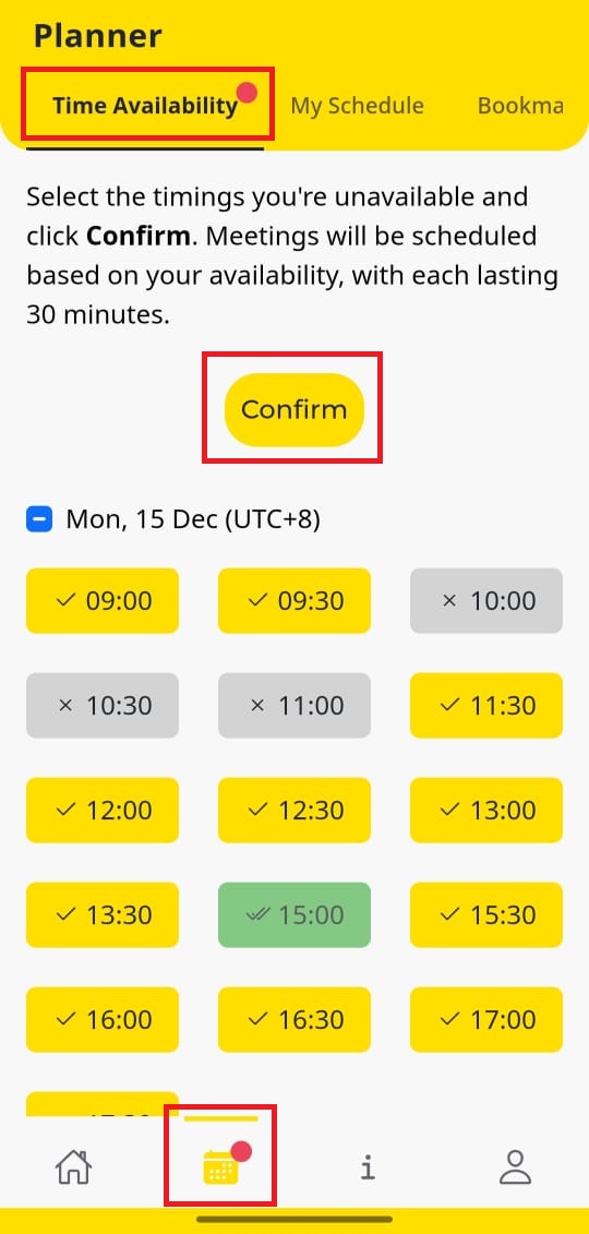 Be sure to indicate your available meeting slots and confirm your schedule before exploring the platform. This will ensure that all your meetings are scheduled within your available time frame.
