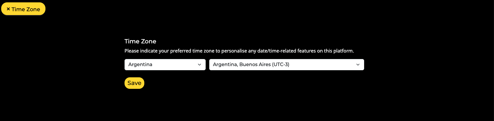 Choose your country and the time zone provided, and once you make the change, hit the Save button and the platform's timing will follow your time zone.