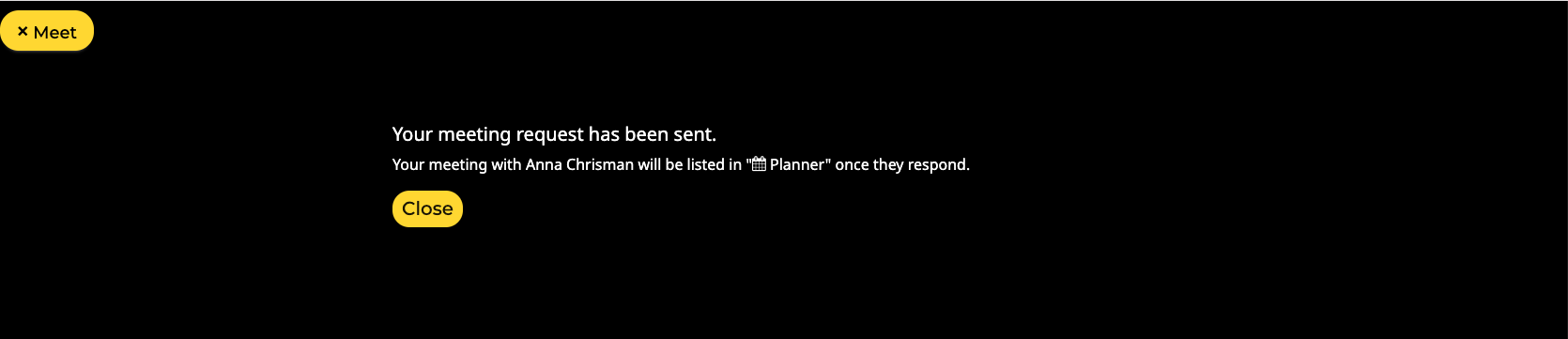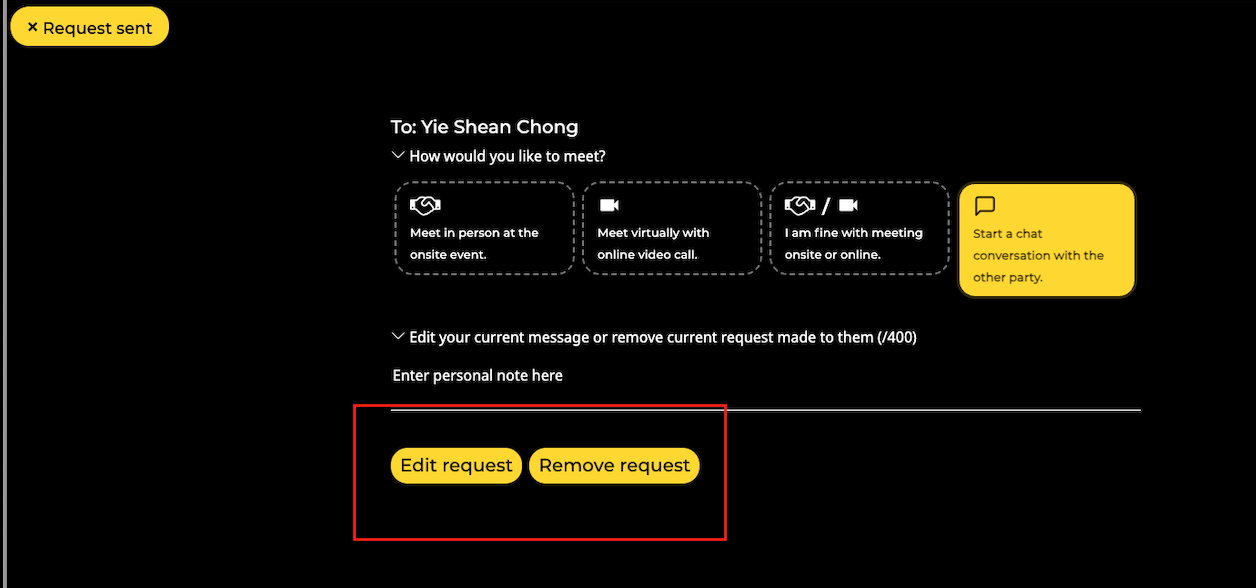 If you would like to remove the request sent, simply click on Remove request. The profile cards will no longer show that a meeting request was sent to them. You have the option to send them a request again should you wish to.