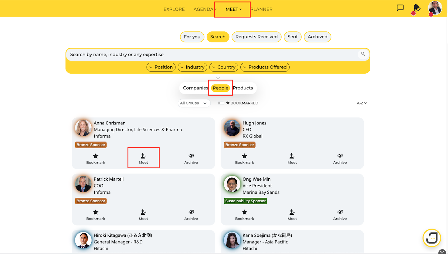 Under the People listing, search for other attendees that you would like to connect with, either directly via the search bar or using the search filters.