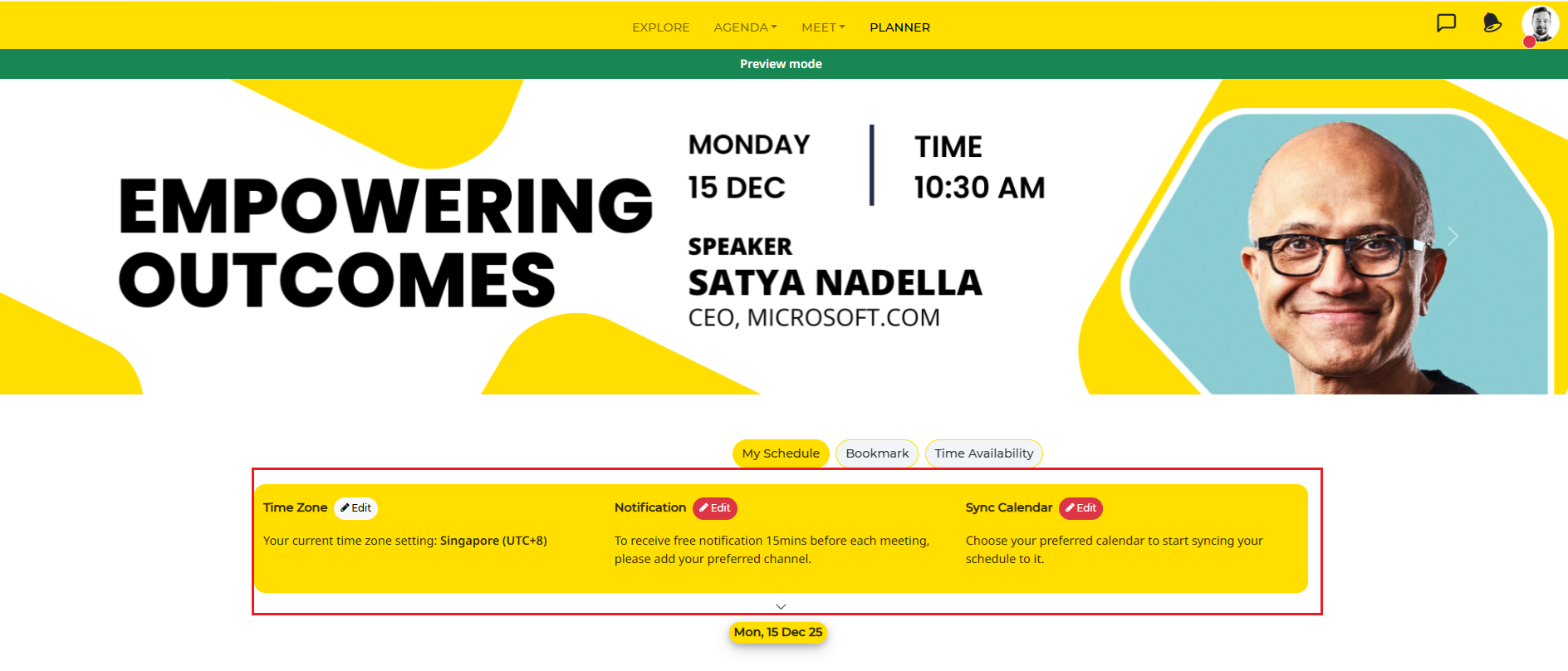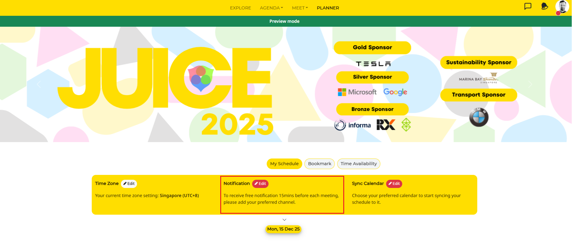 *All meetings (and agenda sessions) are based on your preferred timezone Notifications - to receive timely reminders on your upcoming meetings