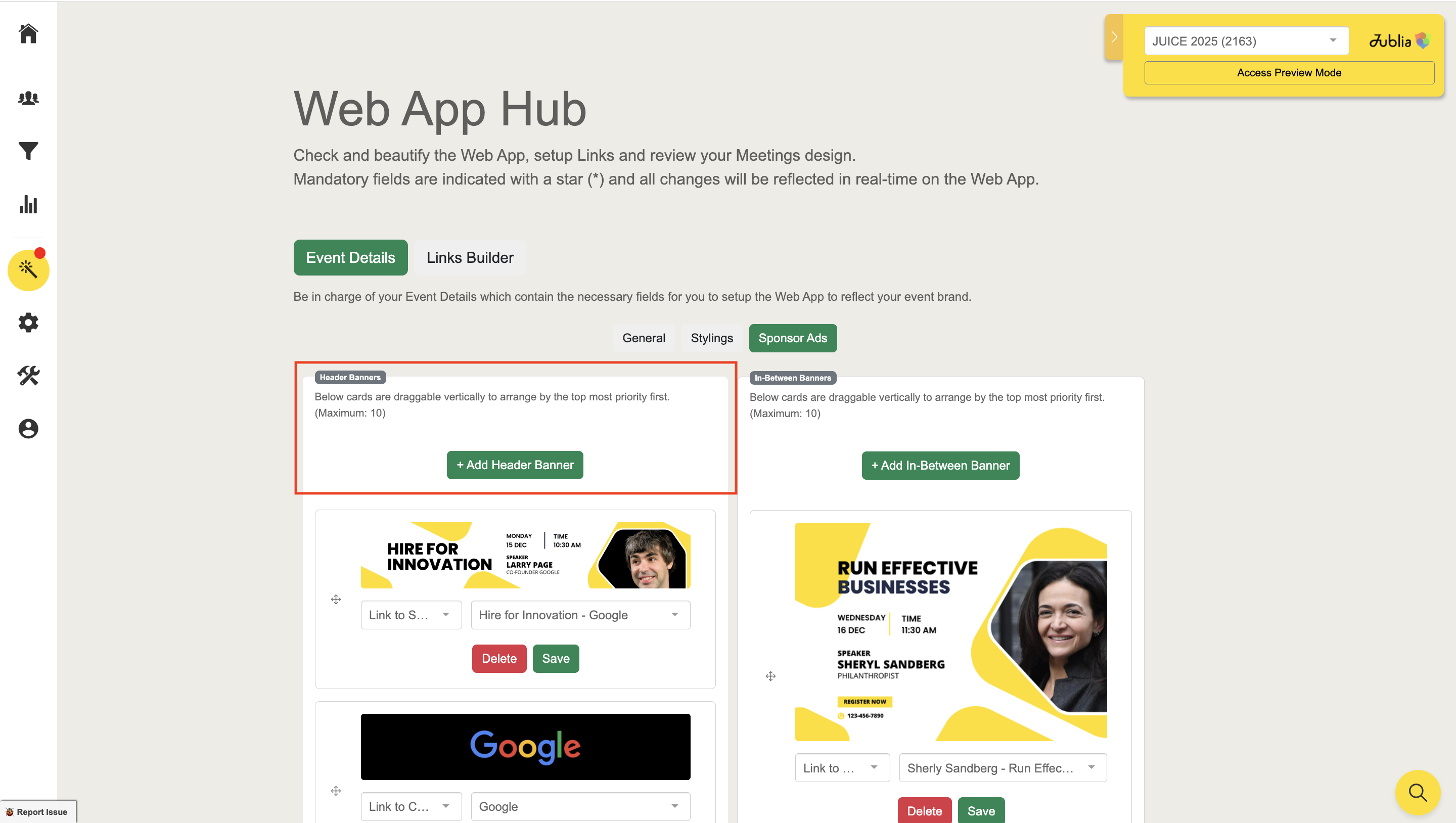 Functionality: Add up to ten banners in user lists (e.g., Meet, Products, Companies).