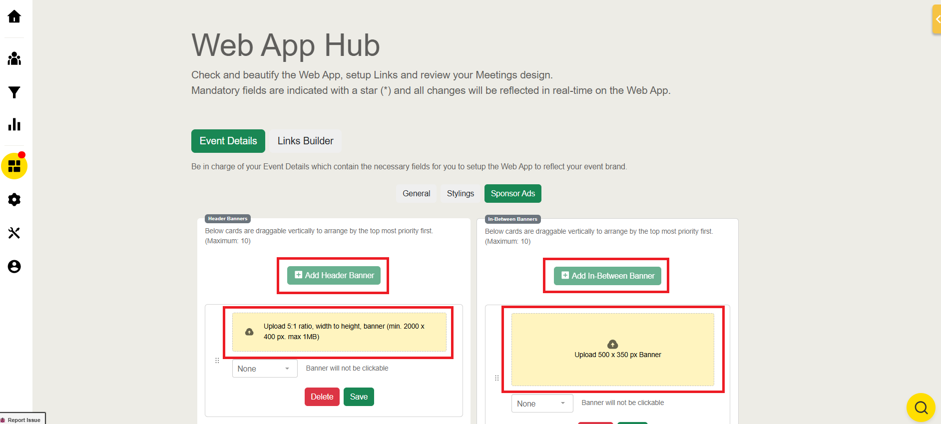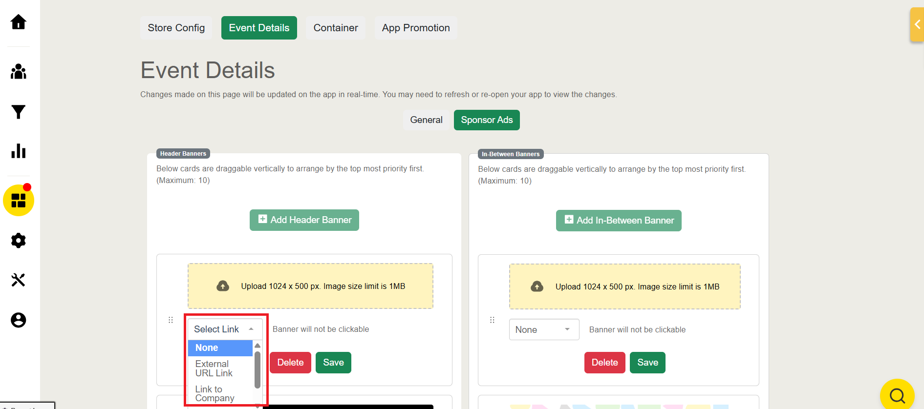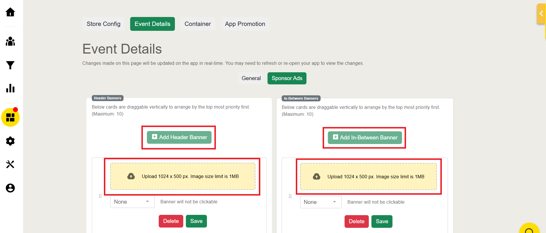 Upload the banner with a size of 2000px by 400px with a maximum size of 1 MB for the Header Banner and 500px by 350px for In-Between Banner.