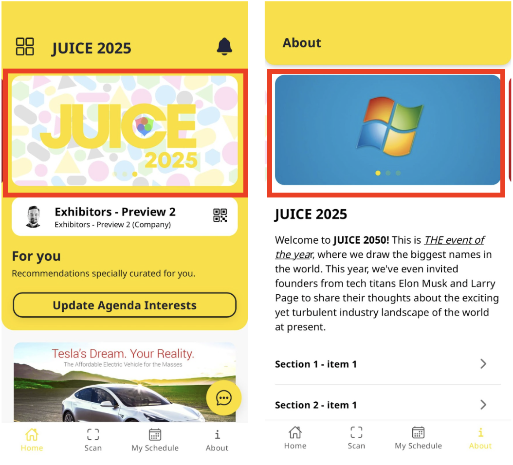 Header Banner in Native App will appear on the Home screen of the app and also on the About page displayed in carousel mode.