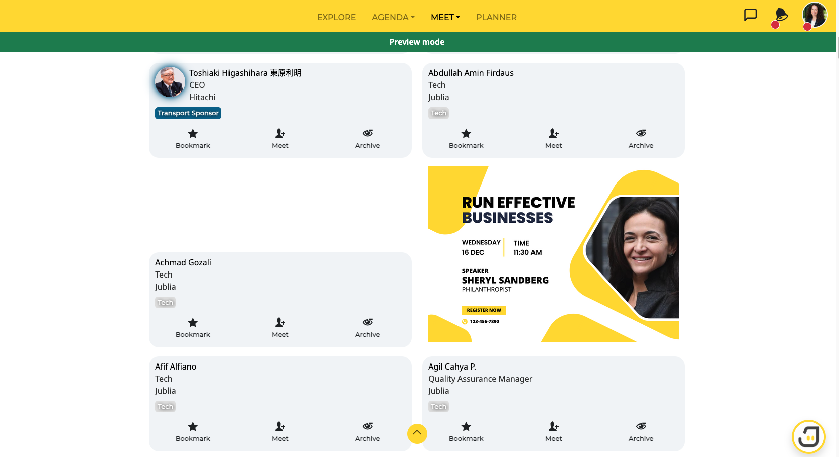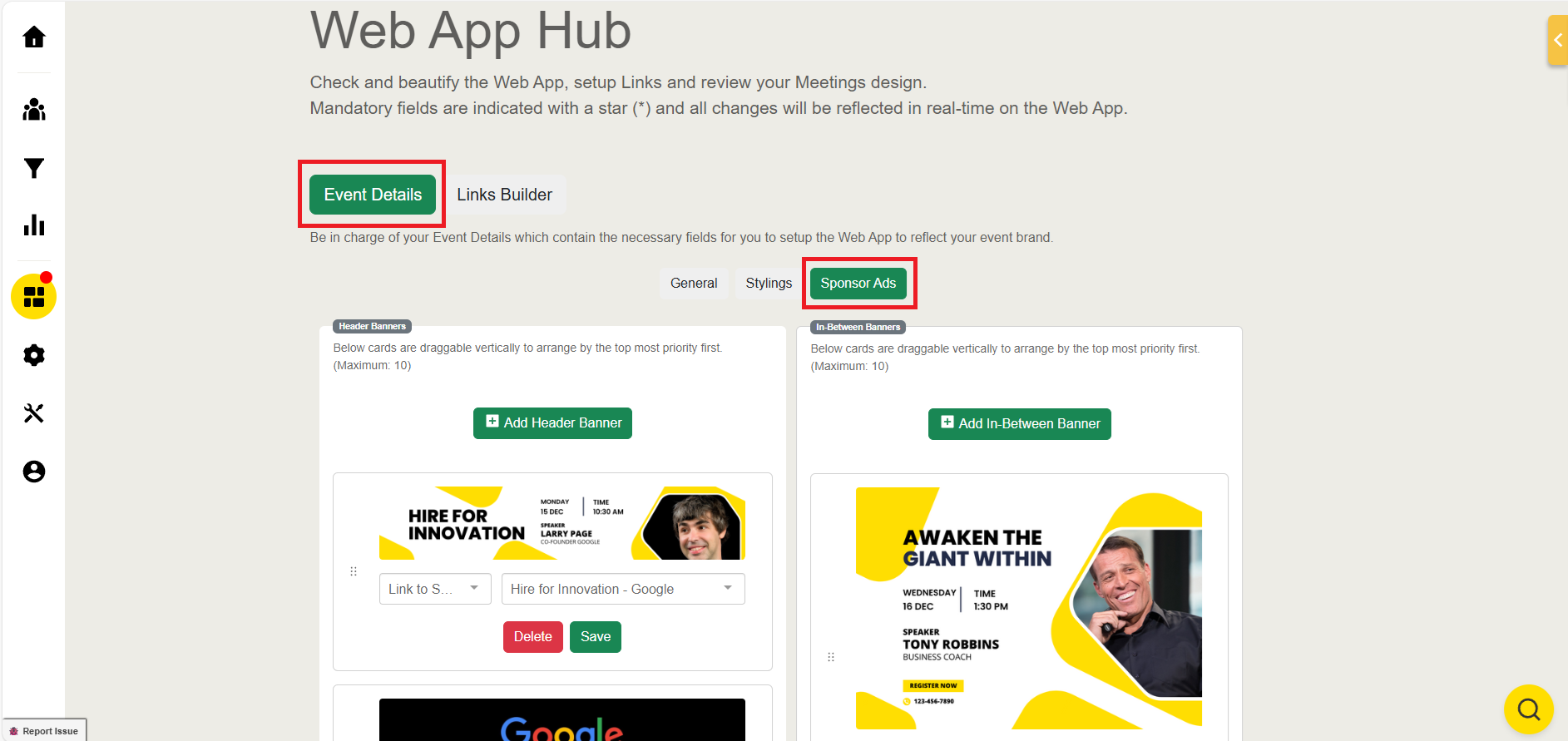 Enhance the visibility of your brand, sessions, and event sponsors with Sponsor Ads – a dynamic tool meticulously crafted for optimal exposure. Jublia provides an impressive selection of 10 rotating header banners and 10 in-between banners, offering generous space for your sponsors to captivate their audience.