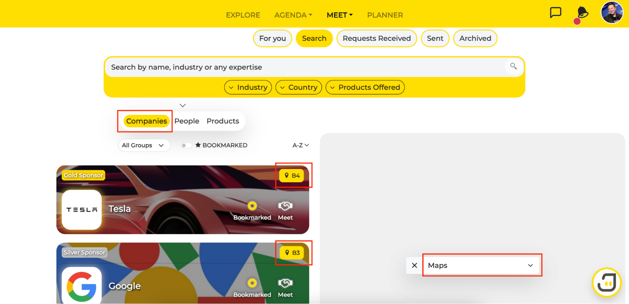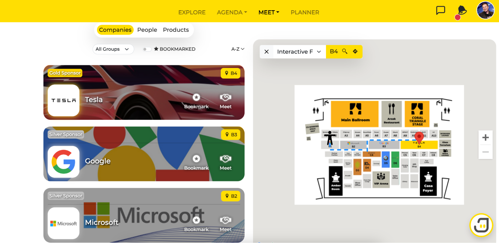 Click on your desired exhibitor’s booth location pointer at the top right corner of the company profile card, and the location of the booth will show up on the interactive floor plan next to it.