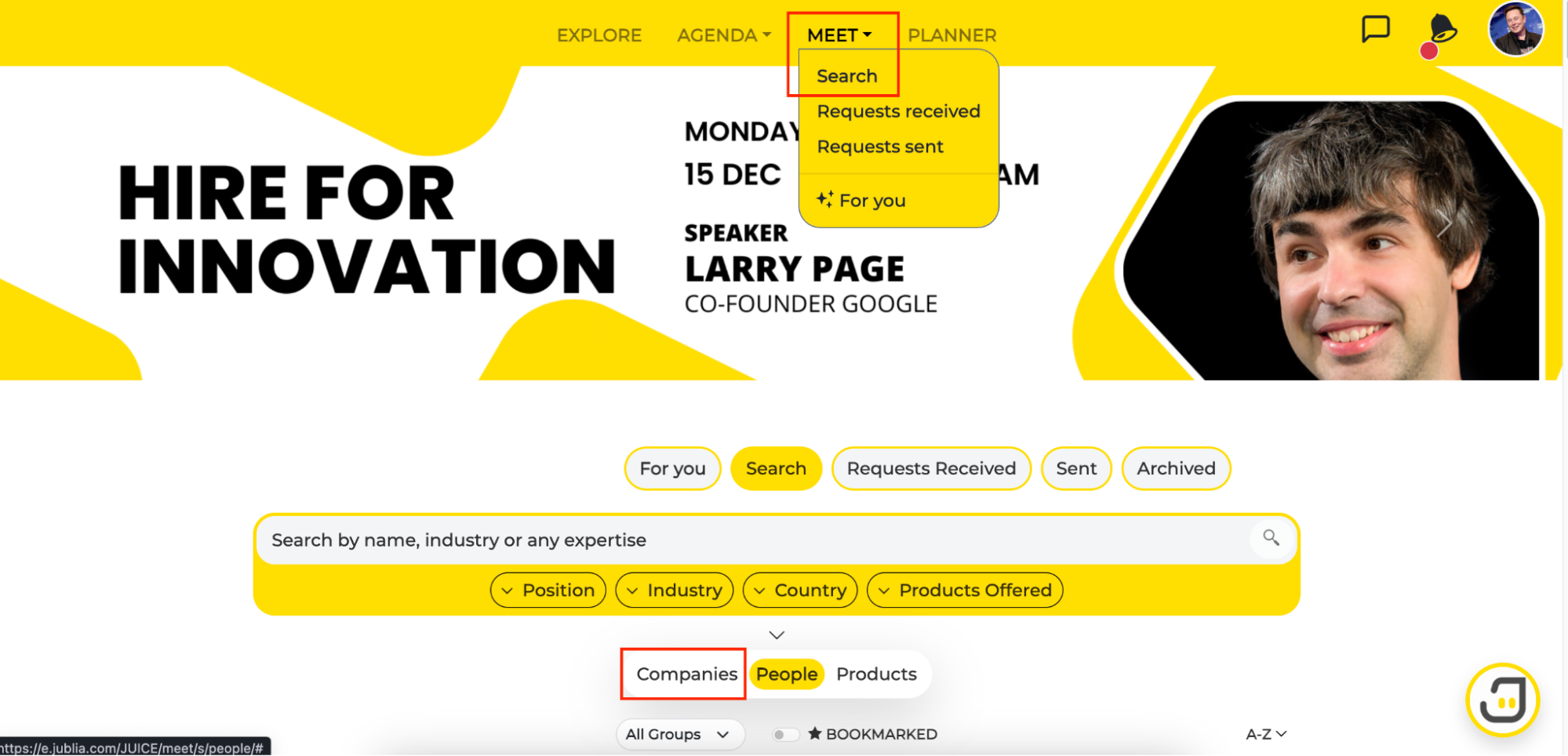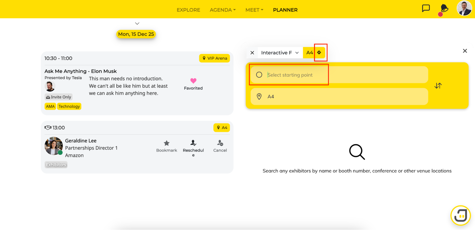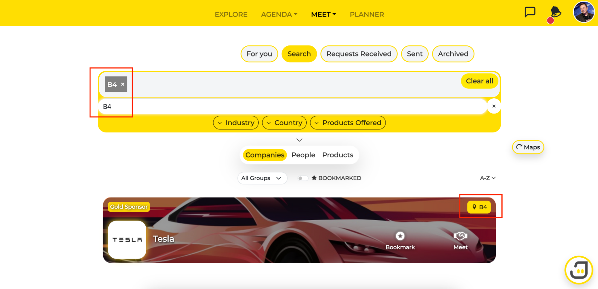 Alternatively, search for the company’s booth in the search bar by keying in the booth name or number.