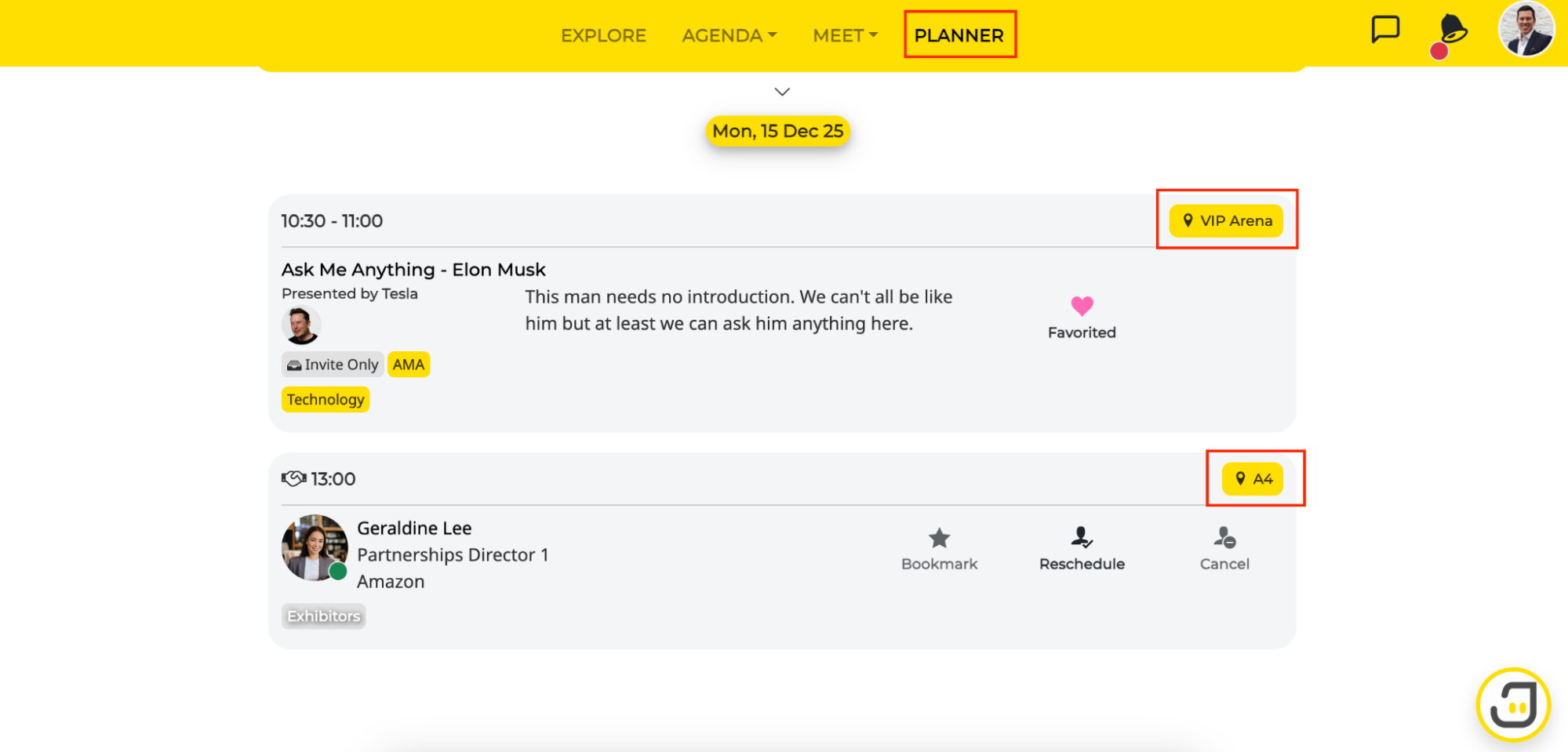 The venue of each meeting or session will be displayed at the top right corner of the meeting or session card.