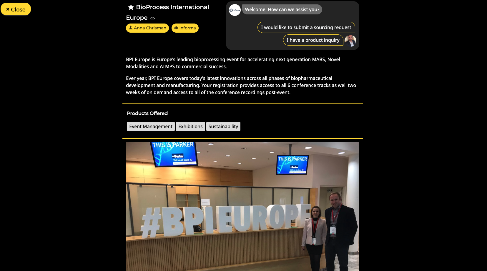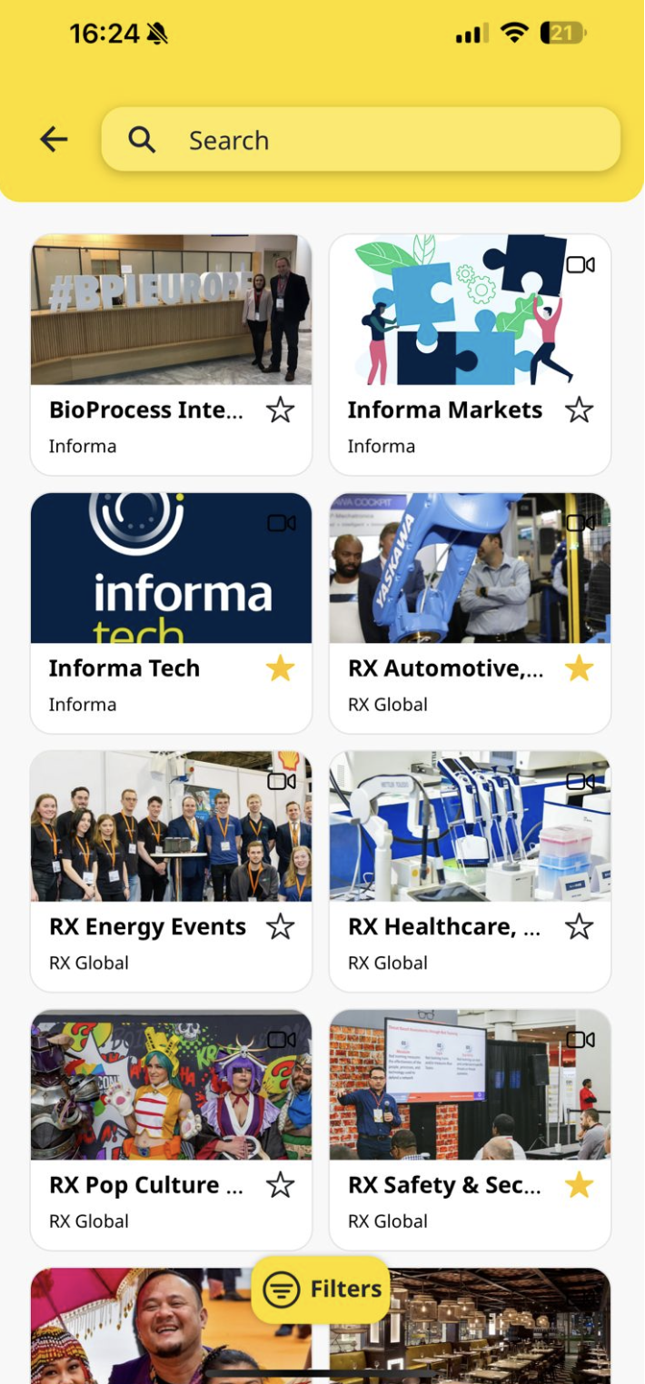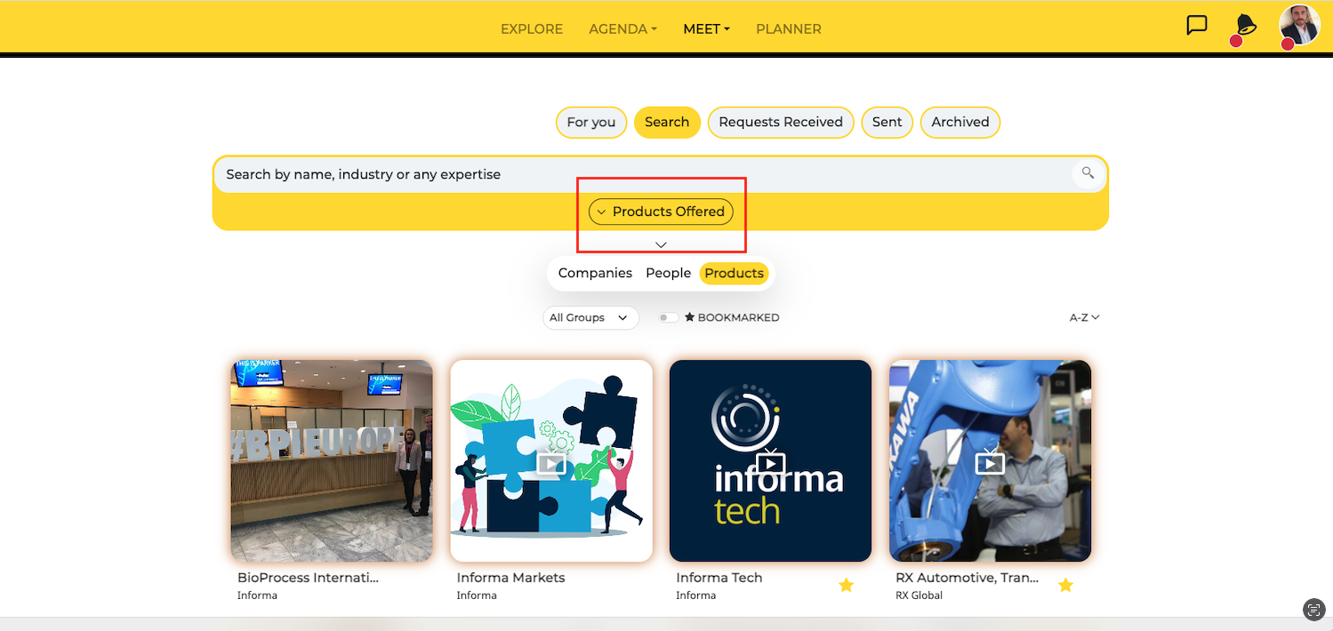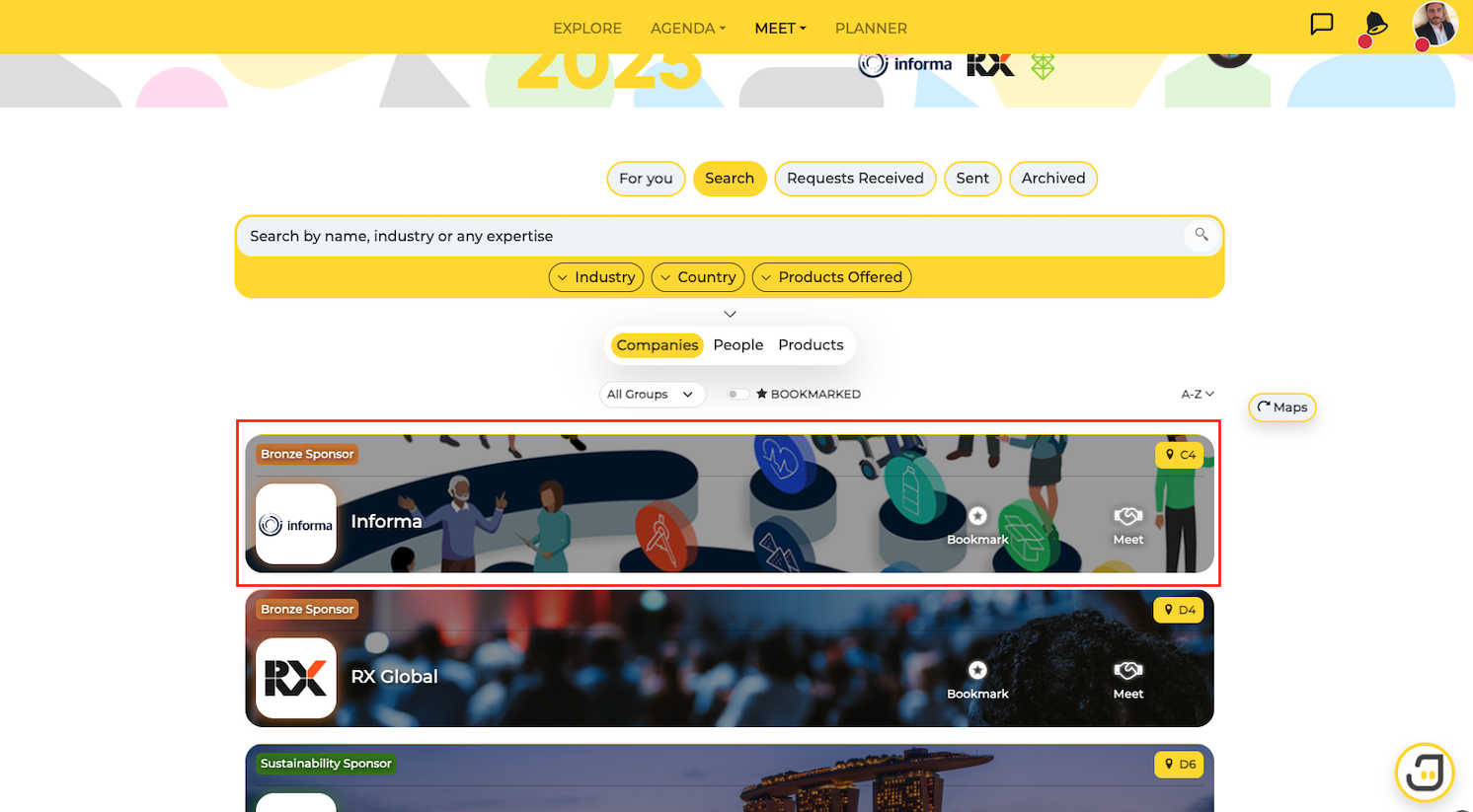 Access the Exhibitors menu to view the list of all companies in the app.