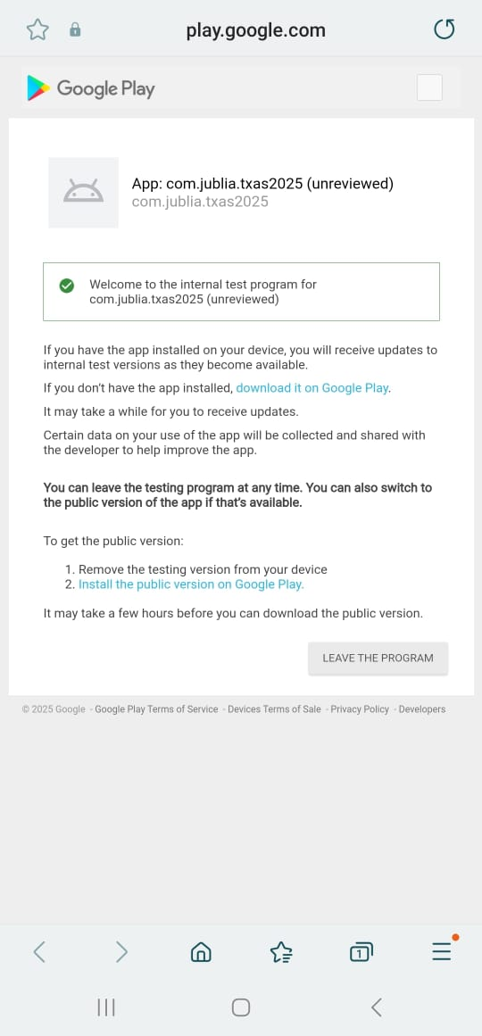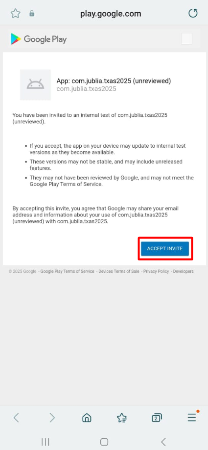 Once you have the Internal Testing link, go to the link URL and Accept the invitation.