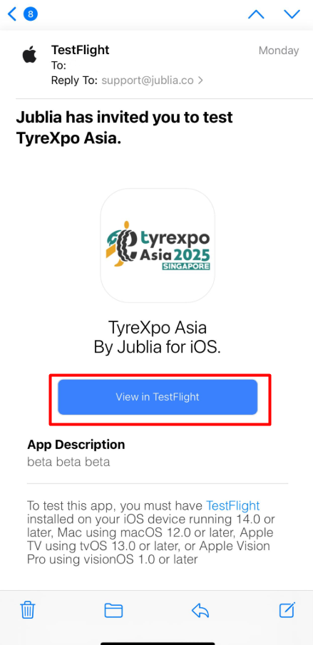 Look out for an email invitation from TestFlight. Please note that the test app can be viewed / downloaded one-time only, after which the link will no longer work. If you don’t see it in your inbox, double-check your spam or junk folder to ensure it didn’t get filtered out.