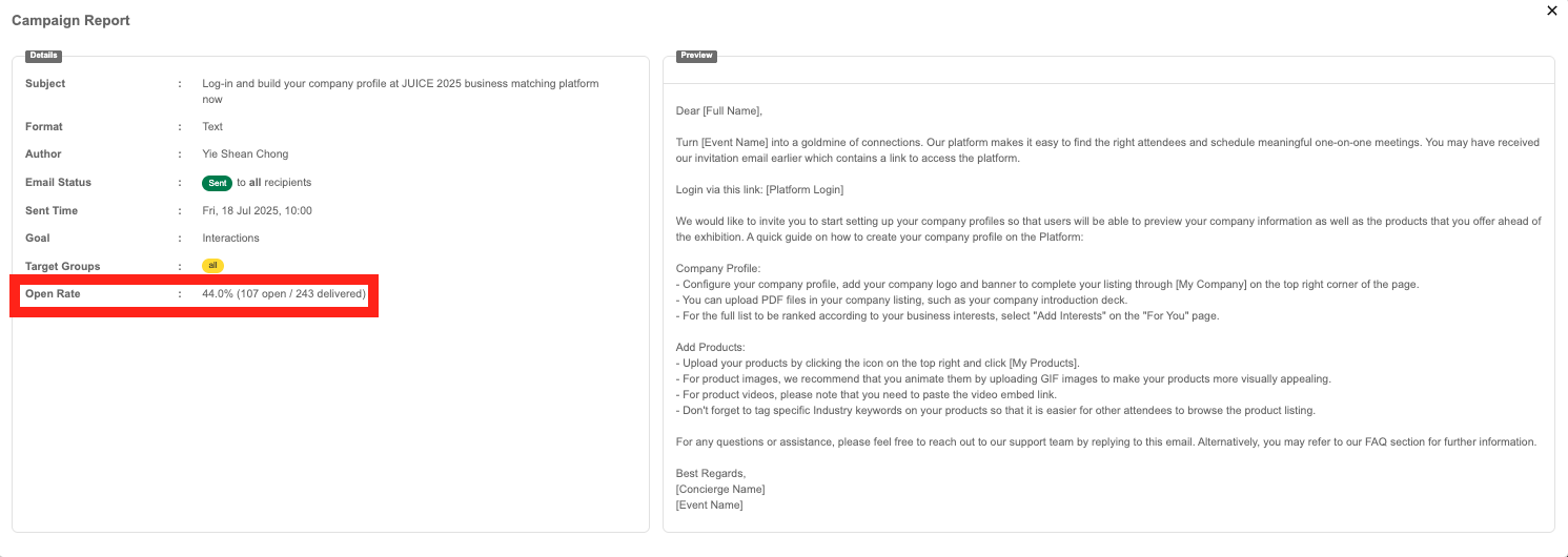 For Sent, Sending, or Failed emails, you can view the open rate inside the campaign details page: