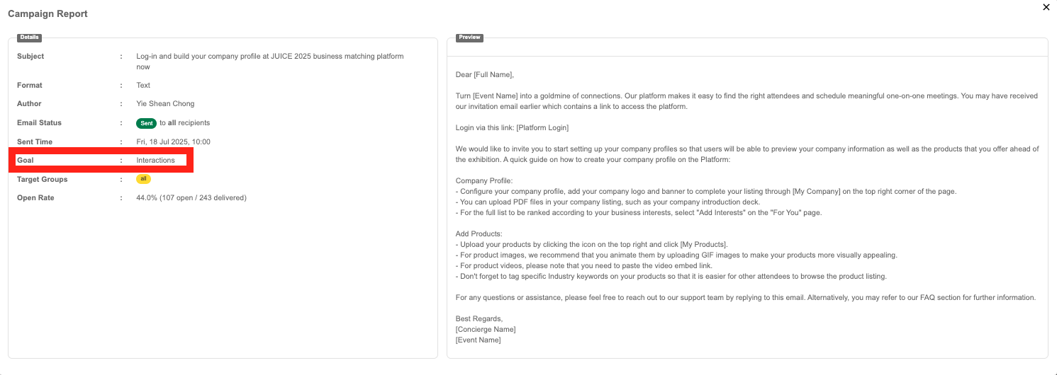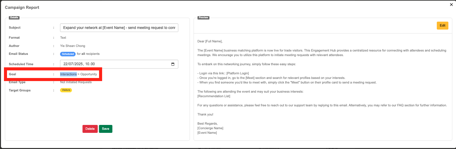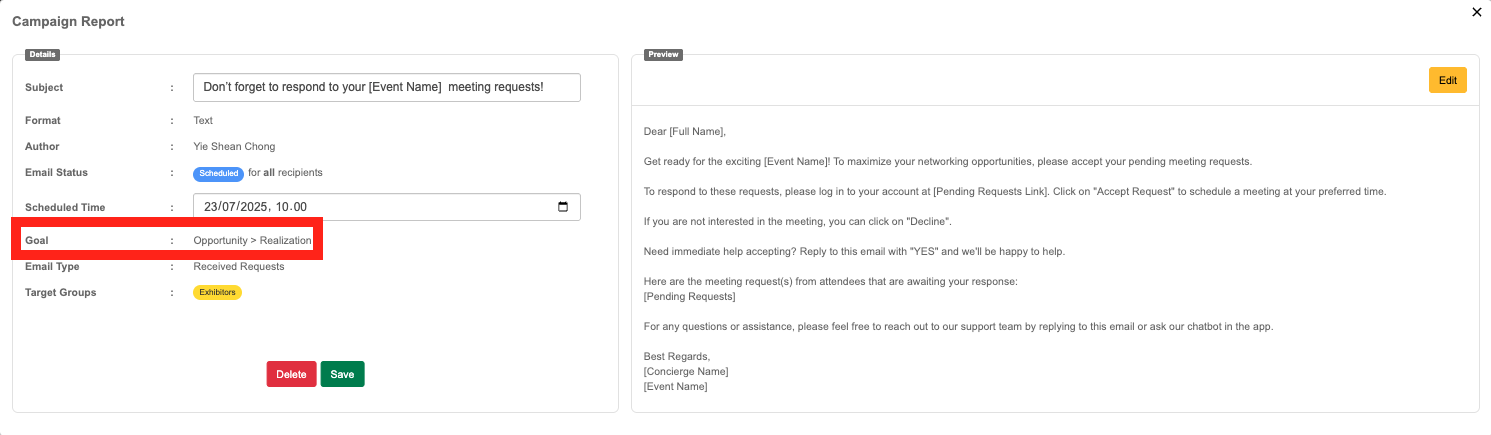 Goals are set by the system based on the Email type selected. They allow us to put the campaigns into perspective of the wider engagement lifecycle of the event.