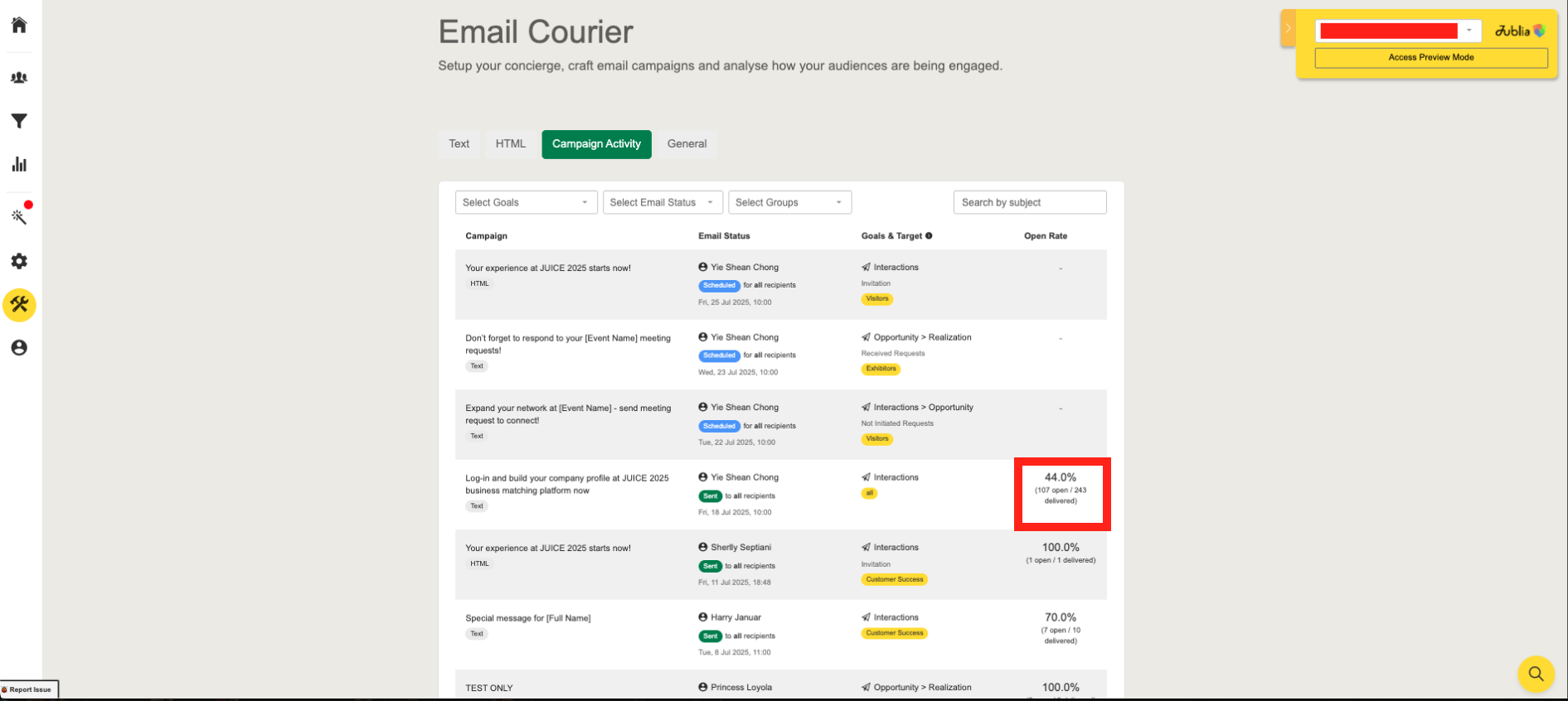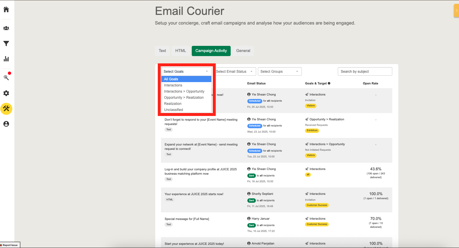Goals Filter: You can analyze the campaign performance and make data-driven decisions by filtering emails based on company activity (All Goals, Interactions, Interactions > Opportunity, Opportunity > Realization, Realization, Unclassified).