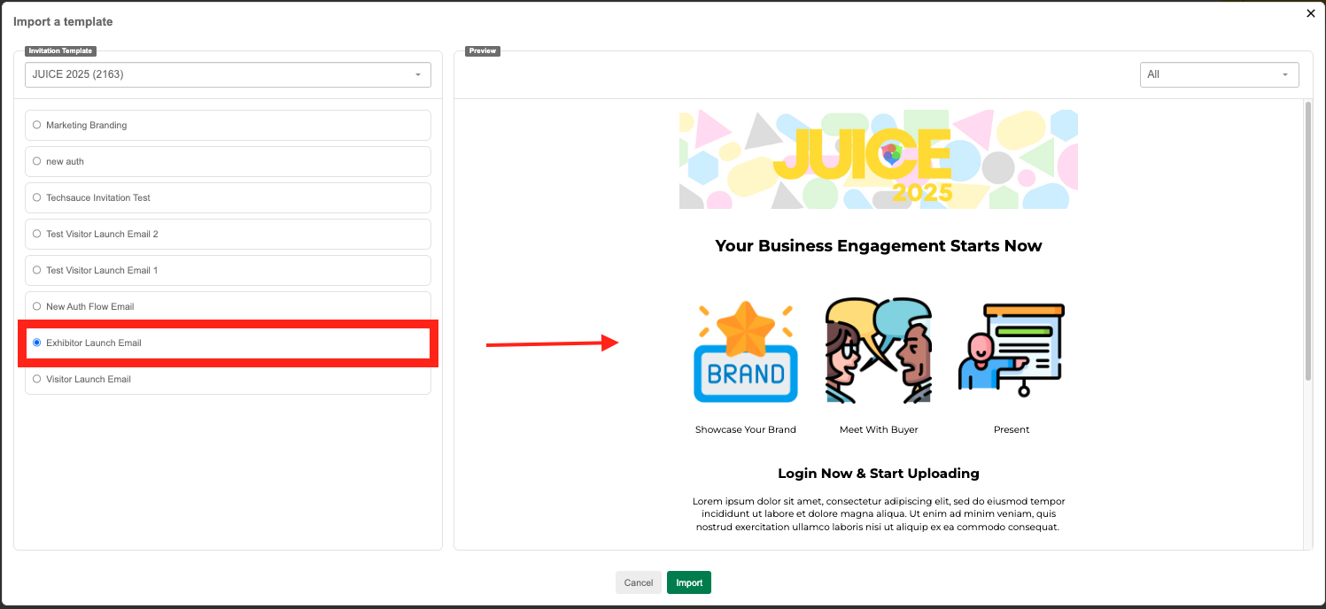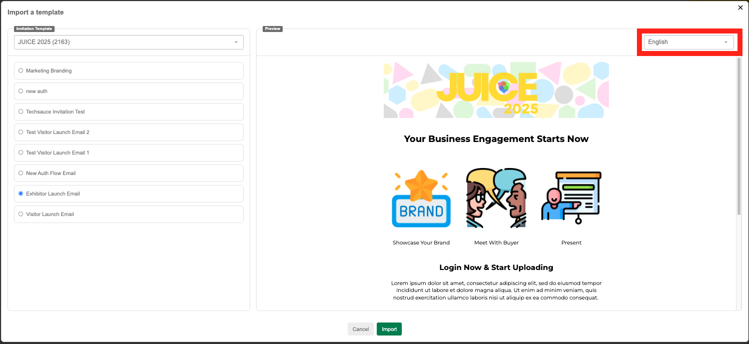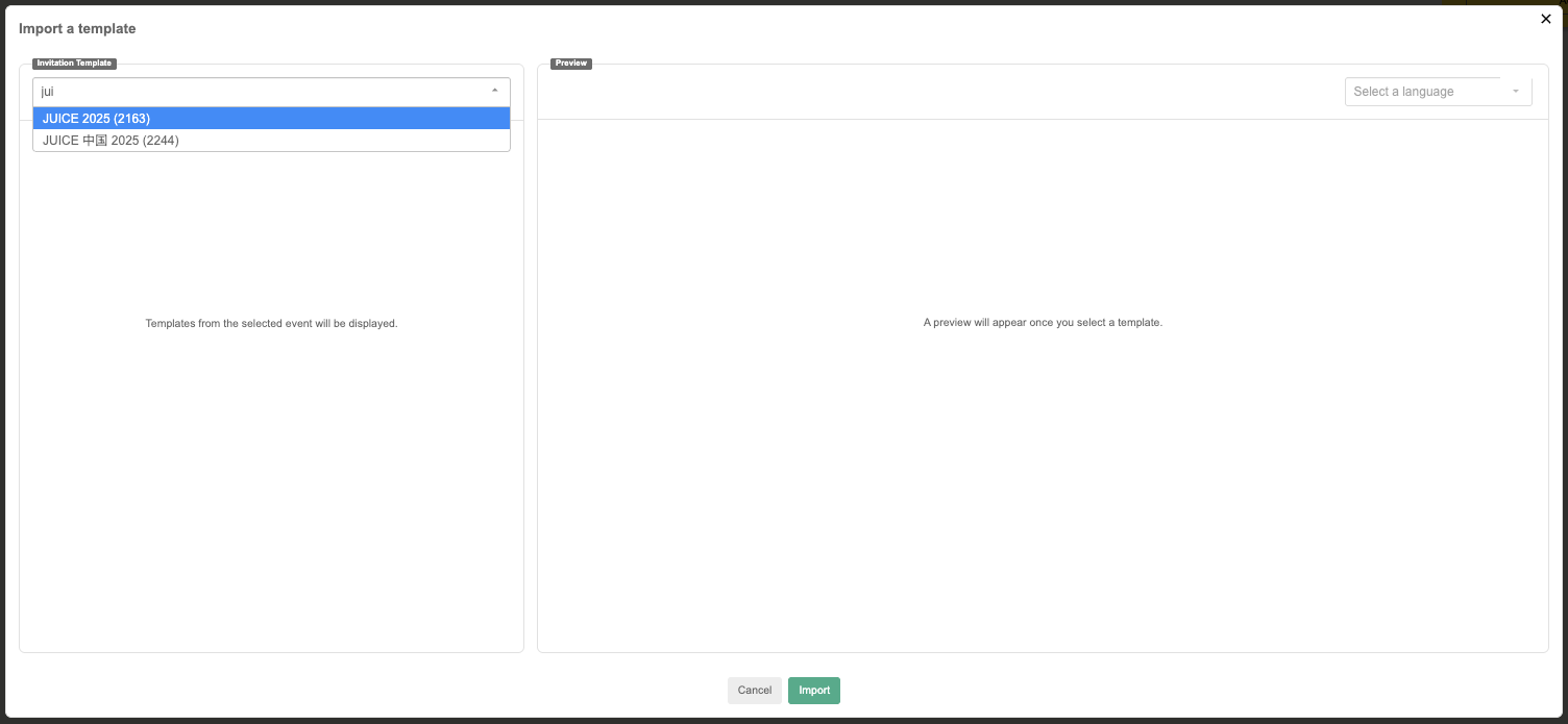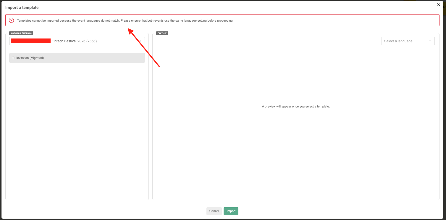 Language Error: If the selected template’s language doesn’t match the current event’s language, the system will block the import.