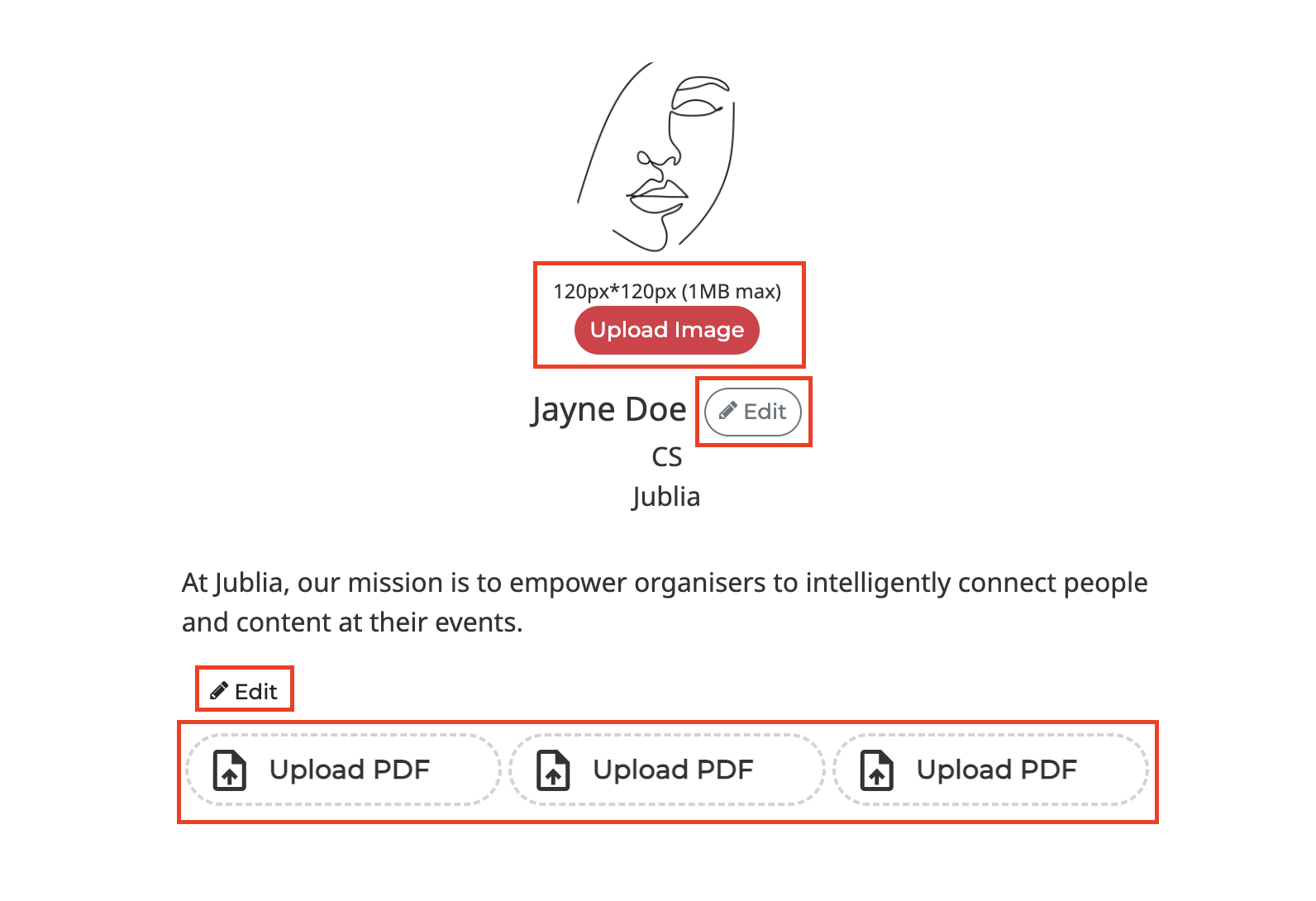 Update your profile details, such as uploading an image, entering your name, job title, Company/Organisation and adding descriptions.