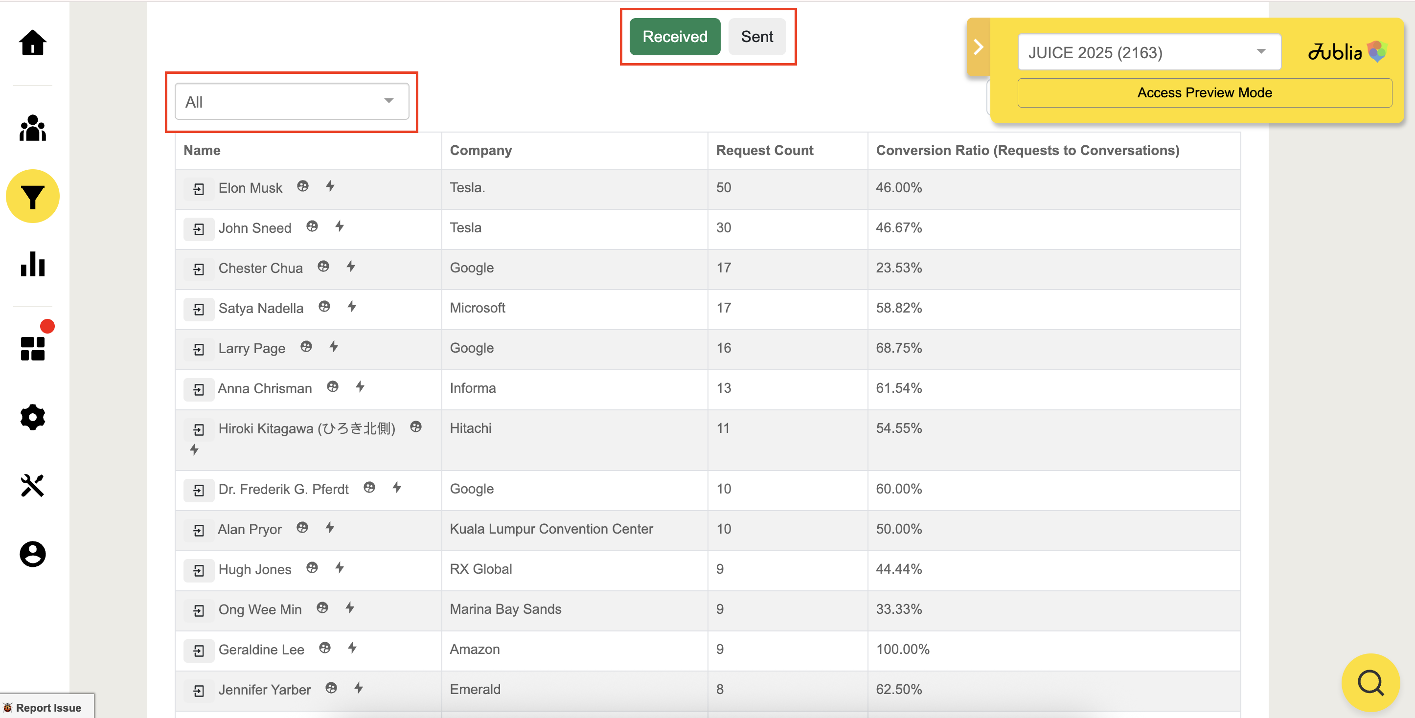 You can use the conversion ratio data to assess how effectively participants are converting their meeting requests into actual meetings. By analyzing this ratio on a per-person basis, you can identify patterns in attendee engagement—such as which individuals or groups are making the most requests but not following through, or which types of requests are more likely to result in confirmed meetings.
