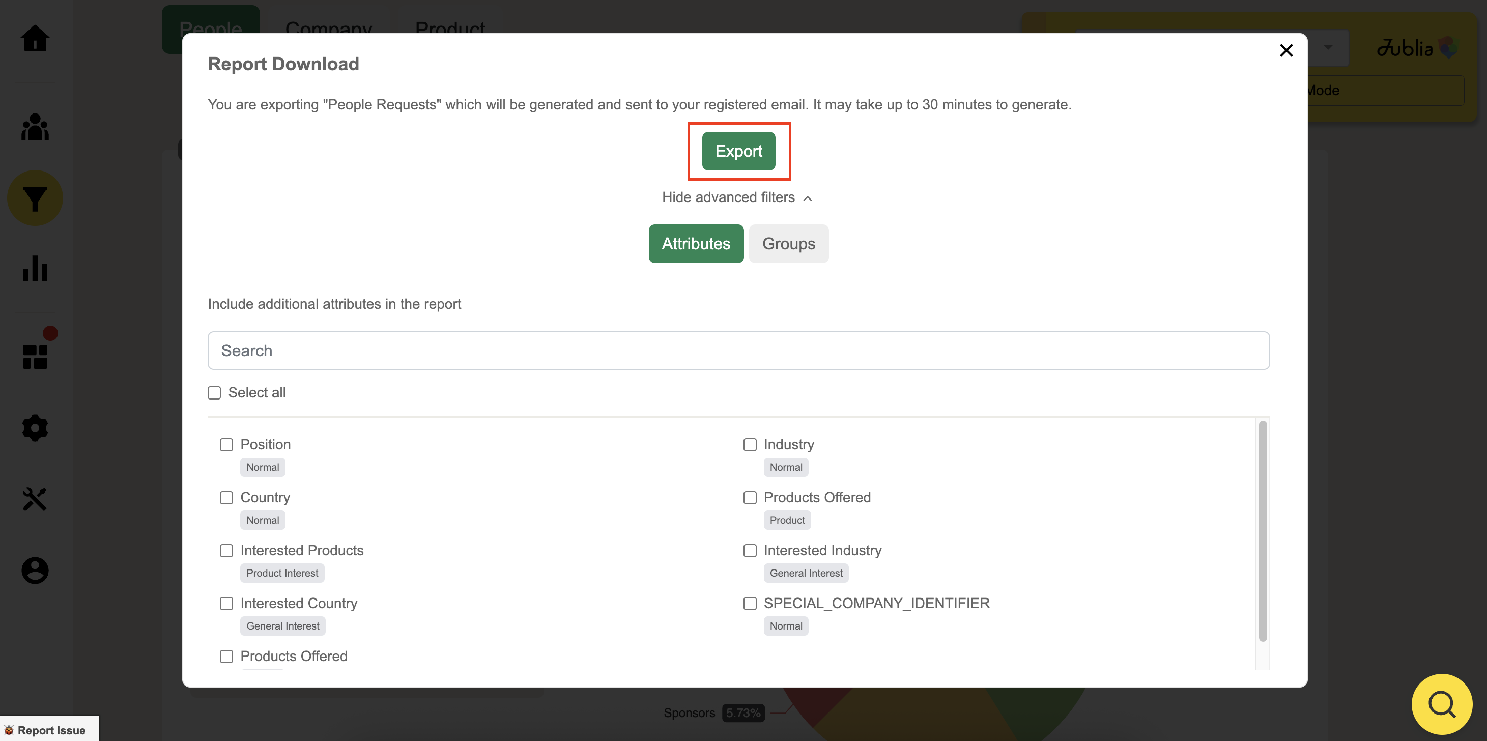 Click the Download Data button (top right Breakdown table) to download the list of bookmarks made or meeting requests. This list will contain both parties’ email and phone number (if provided to us in the database), meeting time, date and location. Before you export the CSV, you can add the attribute(s) available for your event for your CSV report.