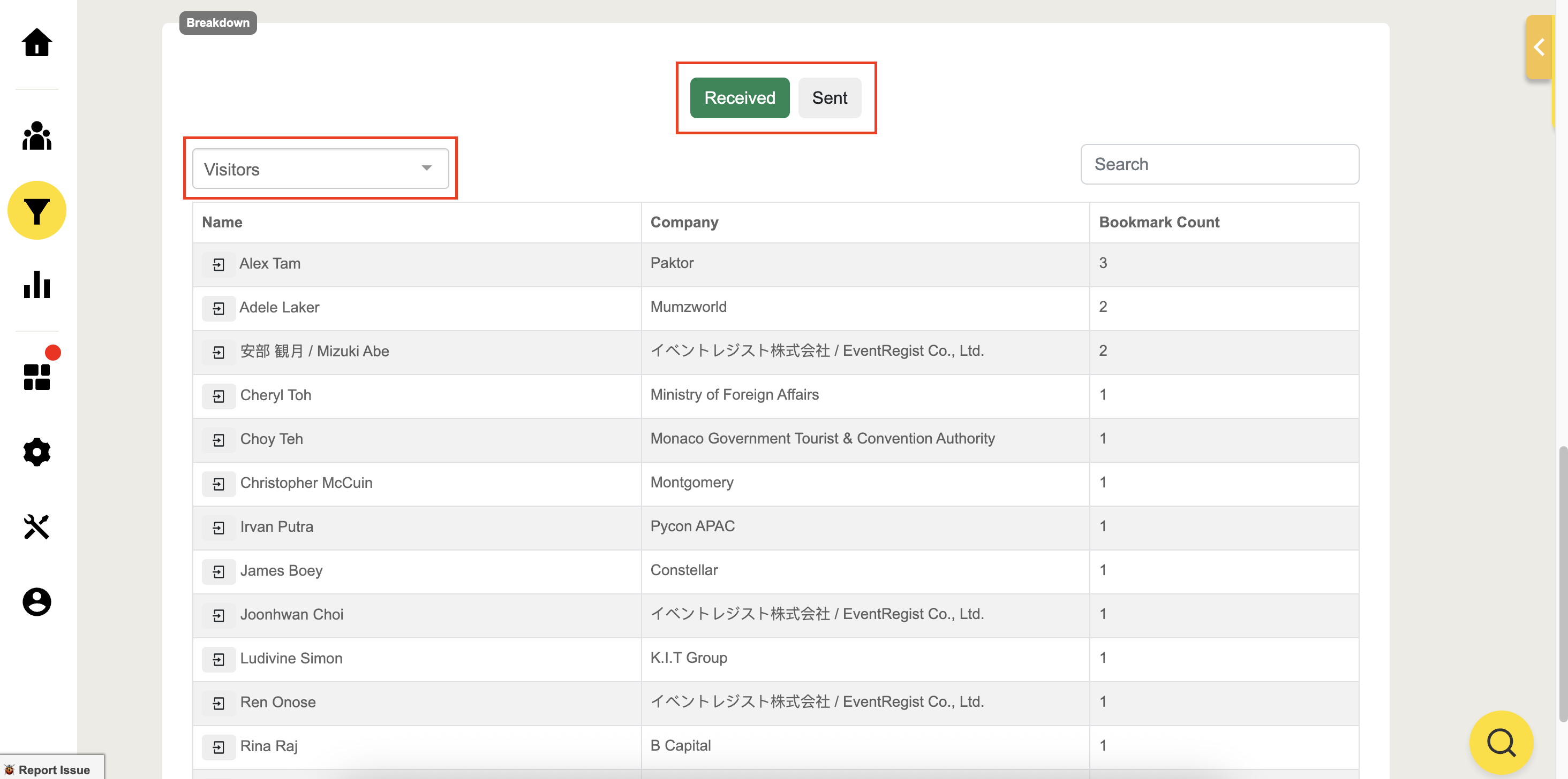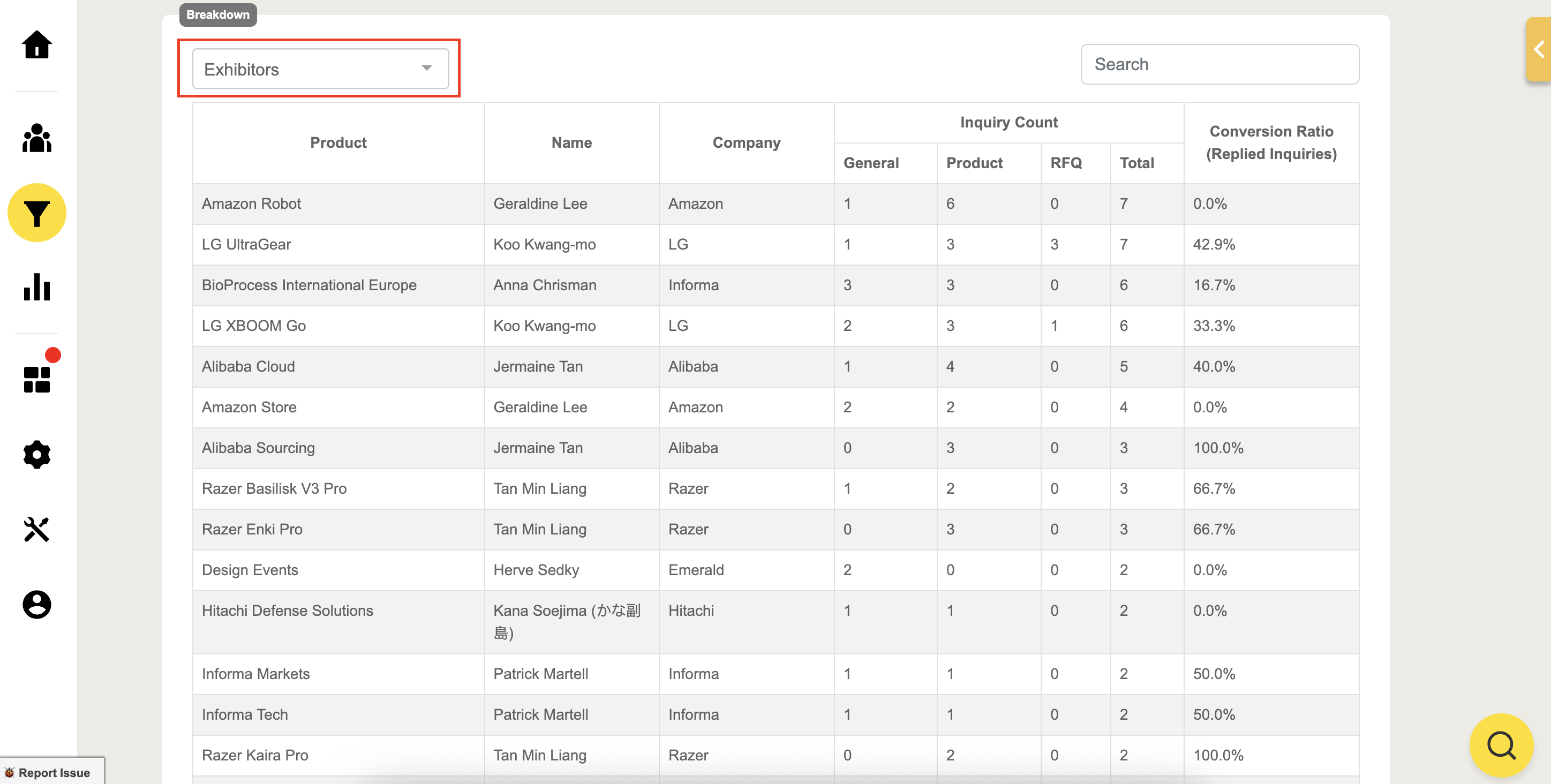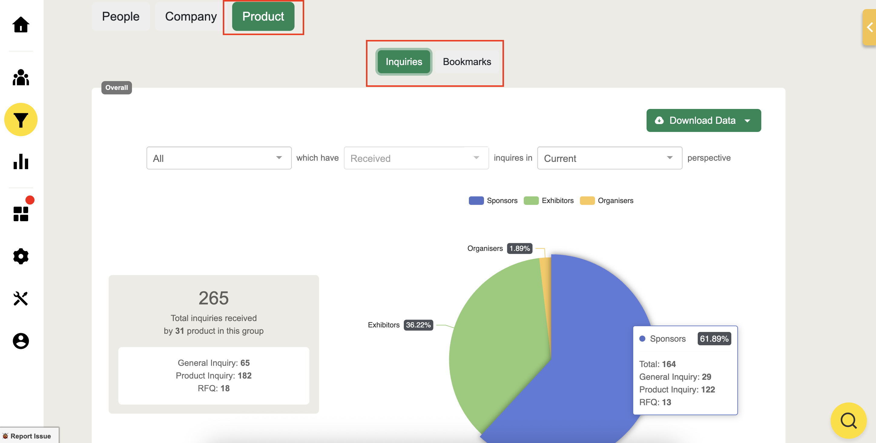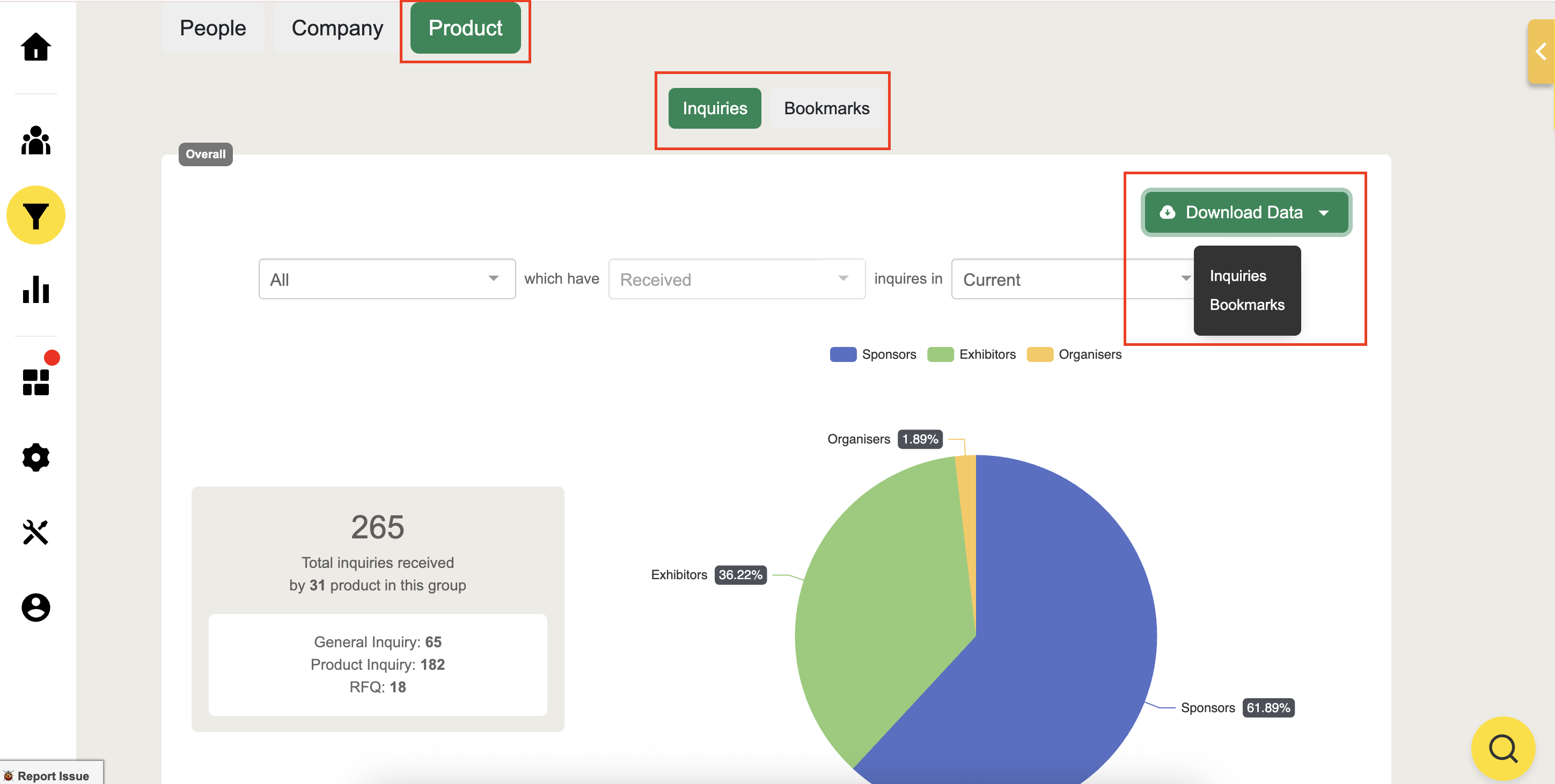 View product inquiries filtered by groups and their total Received inquiry count from attendees.