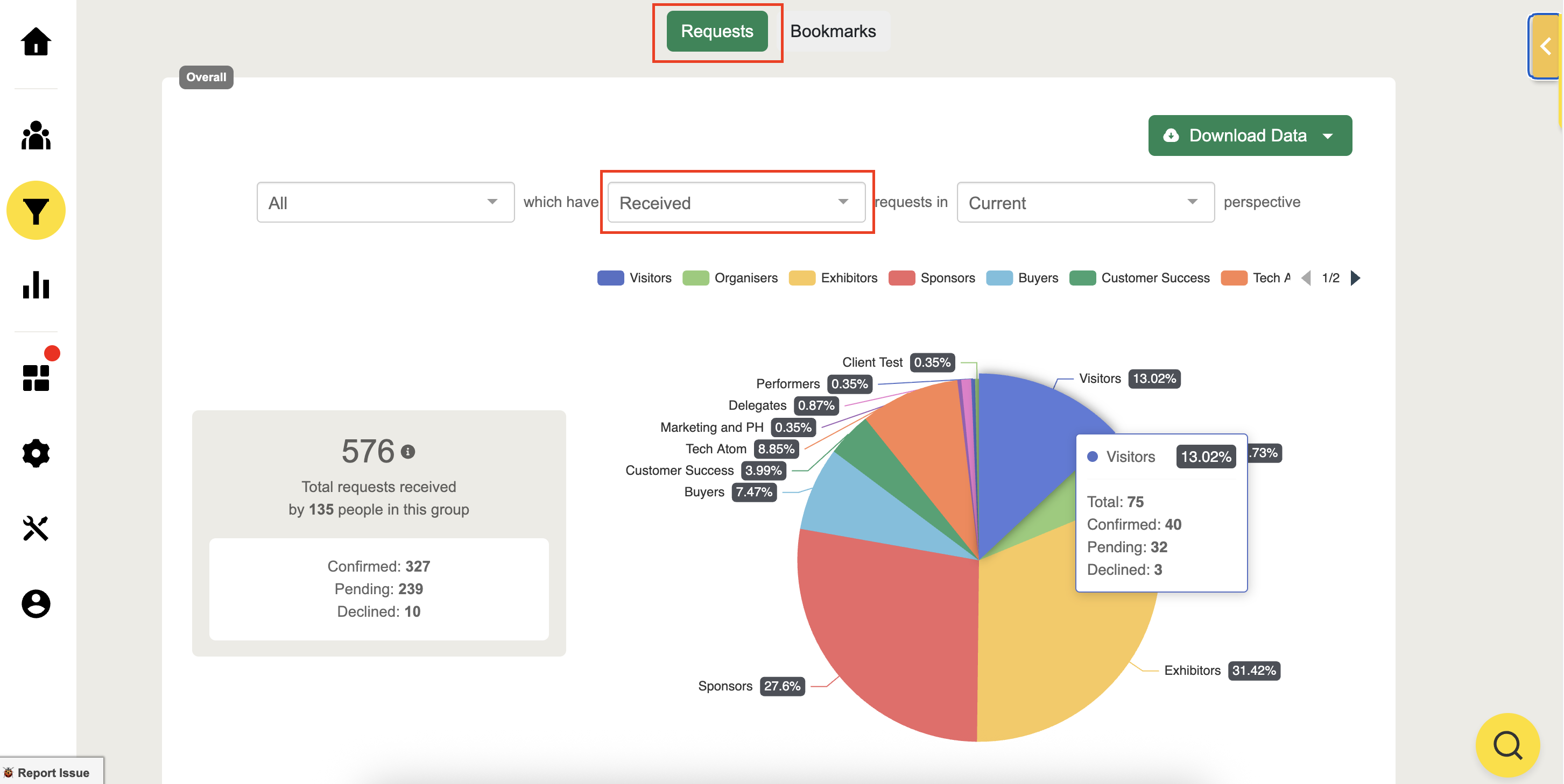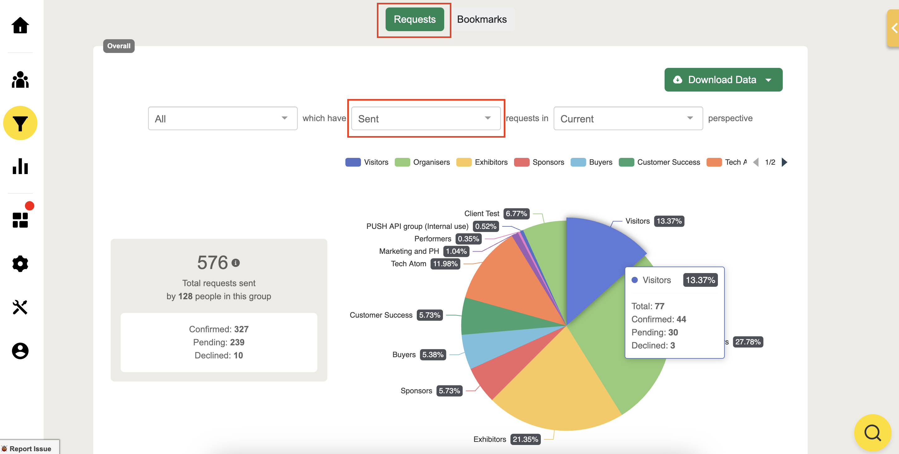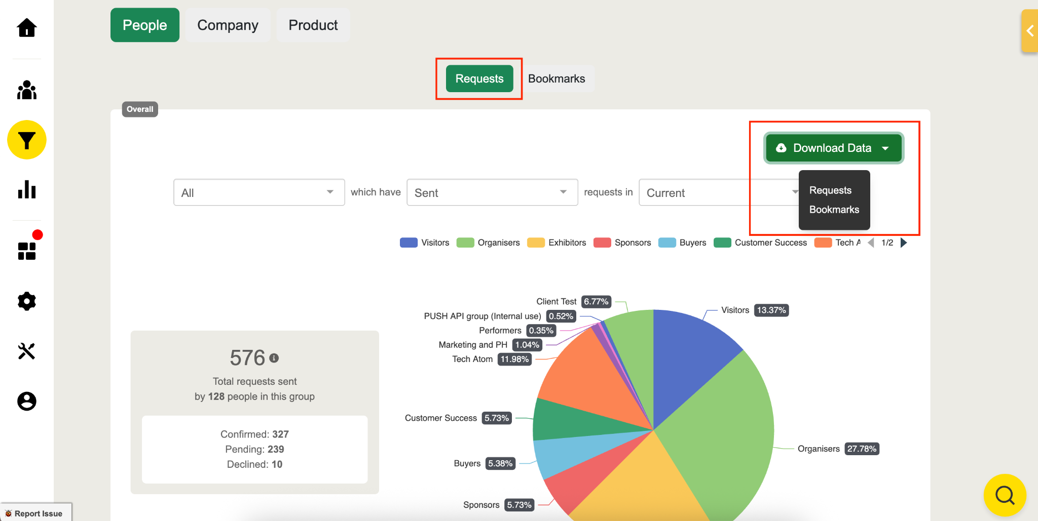 Scroll down to the Acquisition page and see the breakdown to filter and view the number of requests sent by attendees and the ratio of meeting requests that have been accepted as confirmed meetings or conversations.