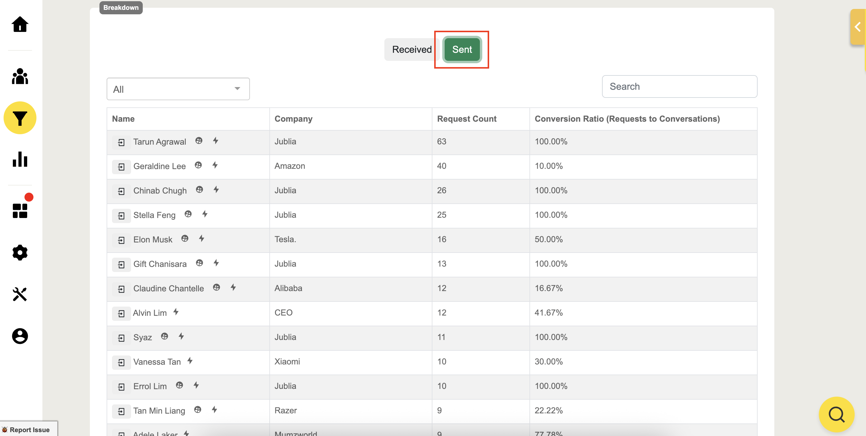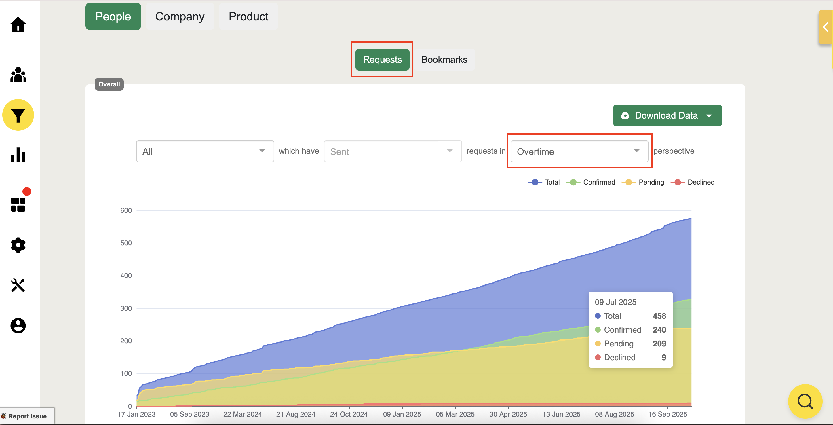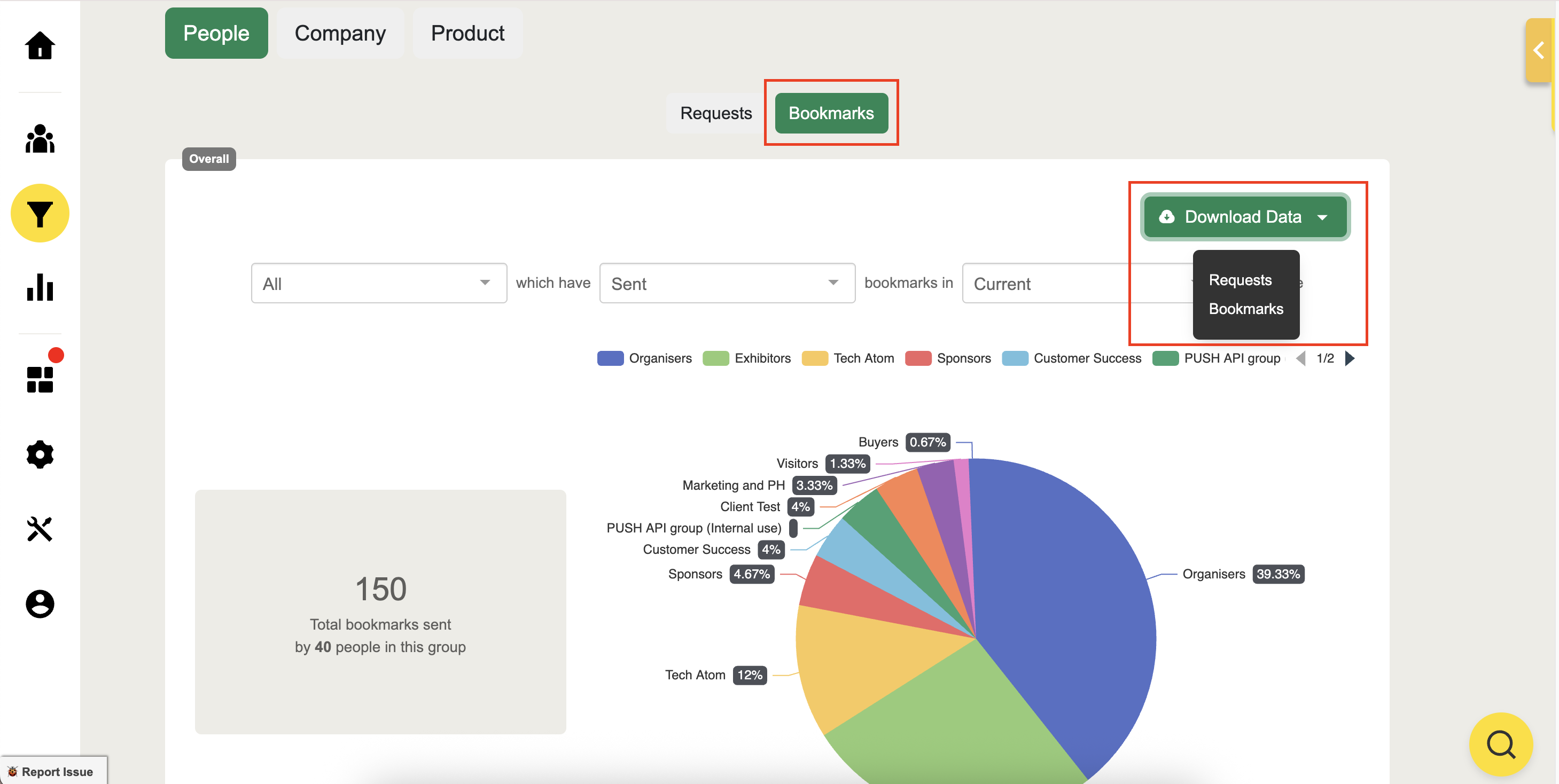 Scroll down to the Acquisition page and see the breakdown to filter and view the number of requests sent by attendees and the ratio of meeting requests that have been accepted as confirmed meetings or conversations.