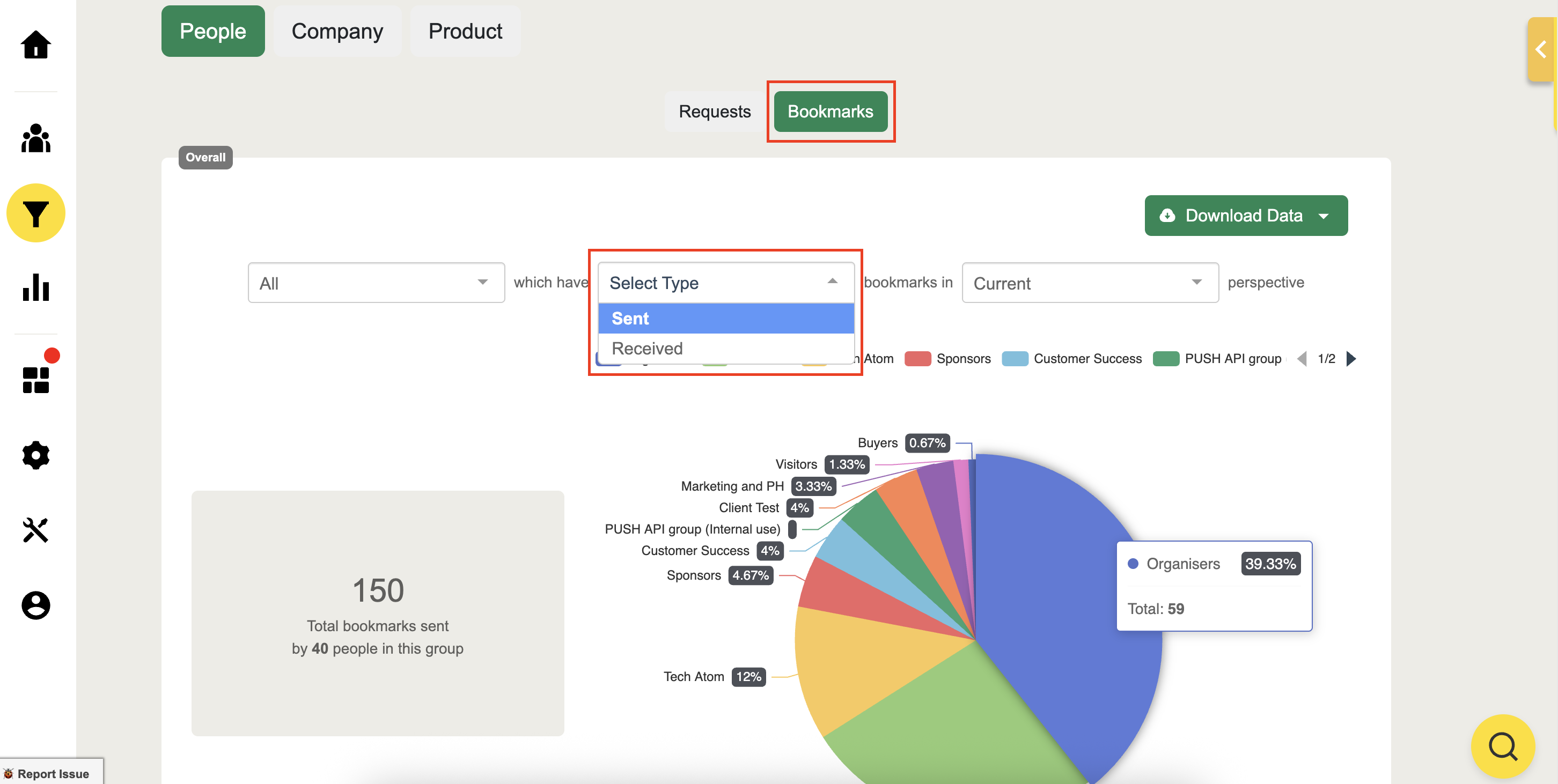 View bookmark filter by groups and their total Sent & Received bookmark count which people have received or sent to others.