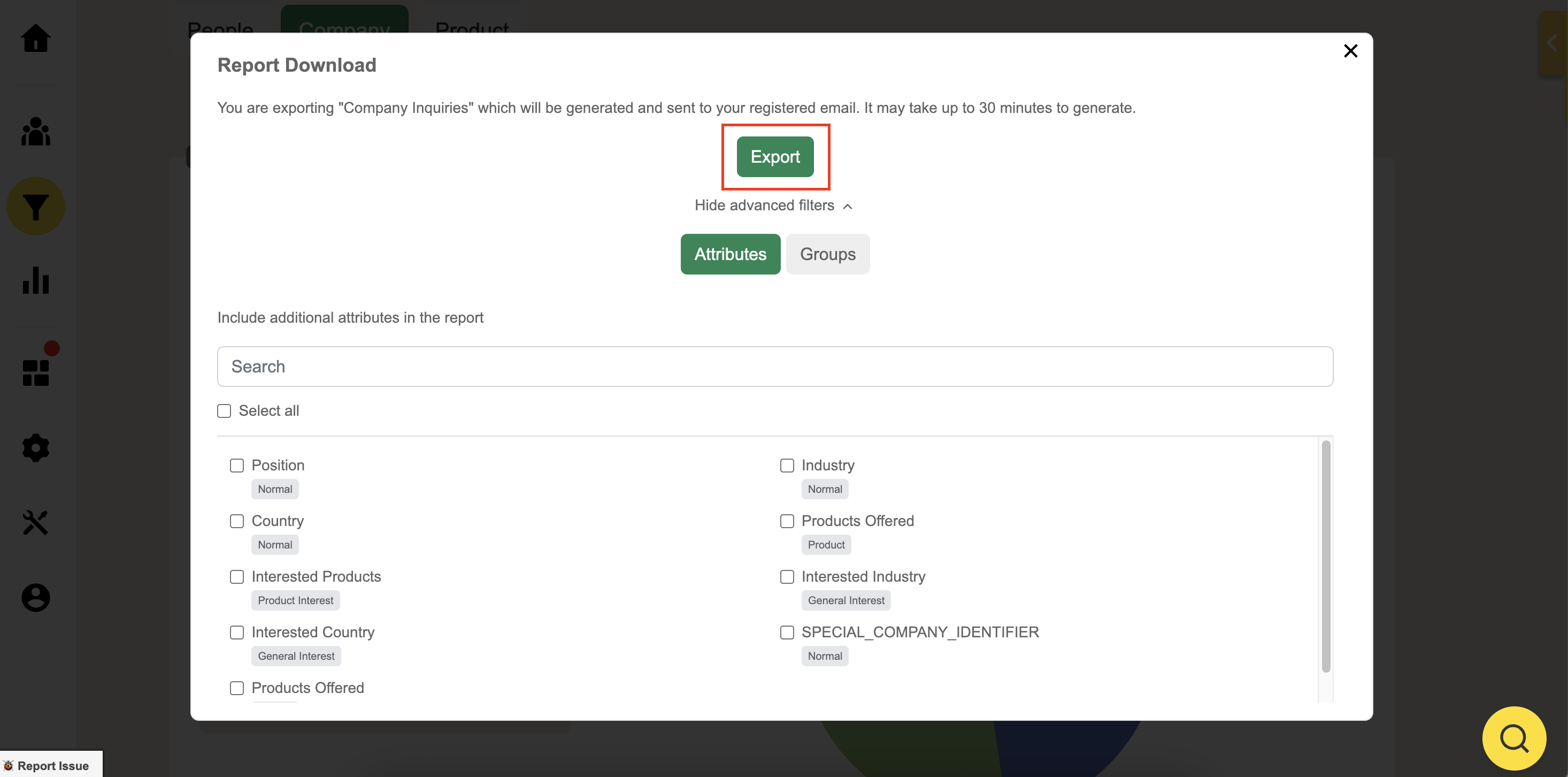 You can also filter your export by attribute and group to include advanced filters to maximize your report data