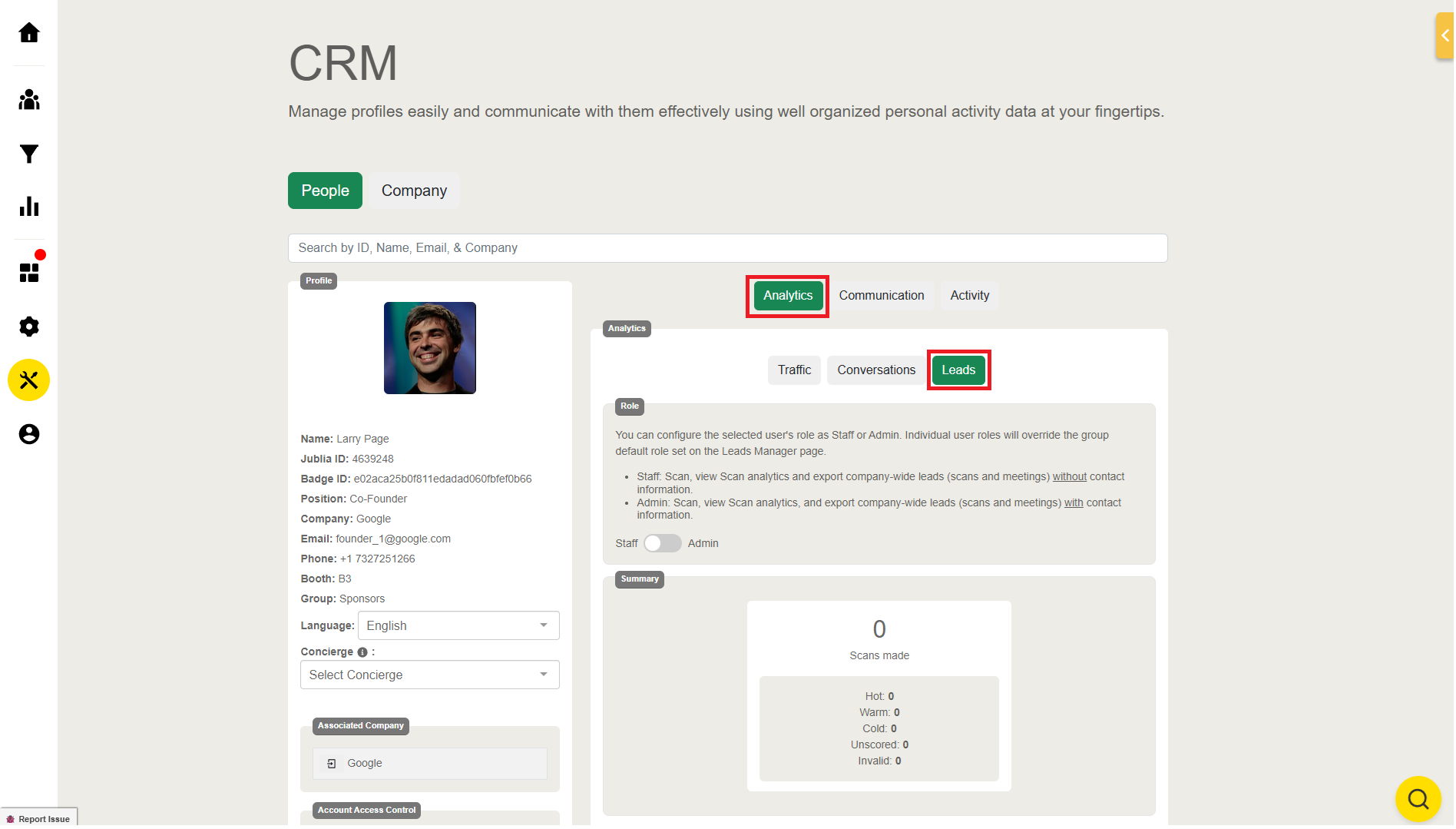 Leads: If the lead scanner is enabled, you can view all leads generated by the account.