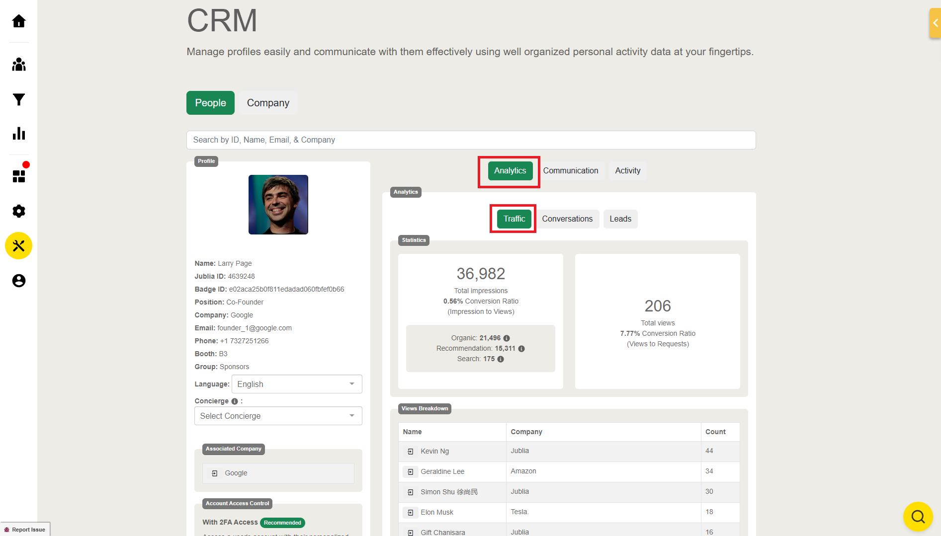 Analytics: Analytics give you a comprehensive overview of an account's traffic, conversations, and leads.