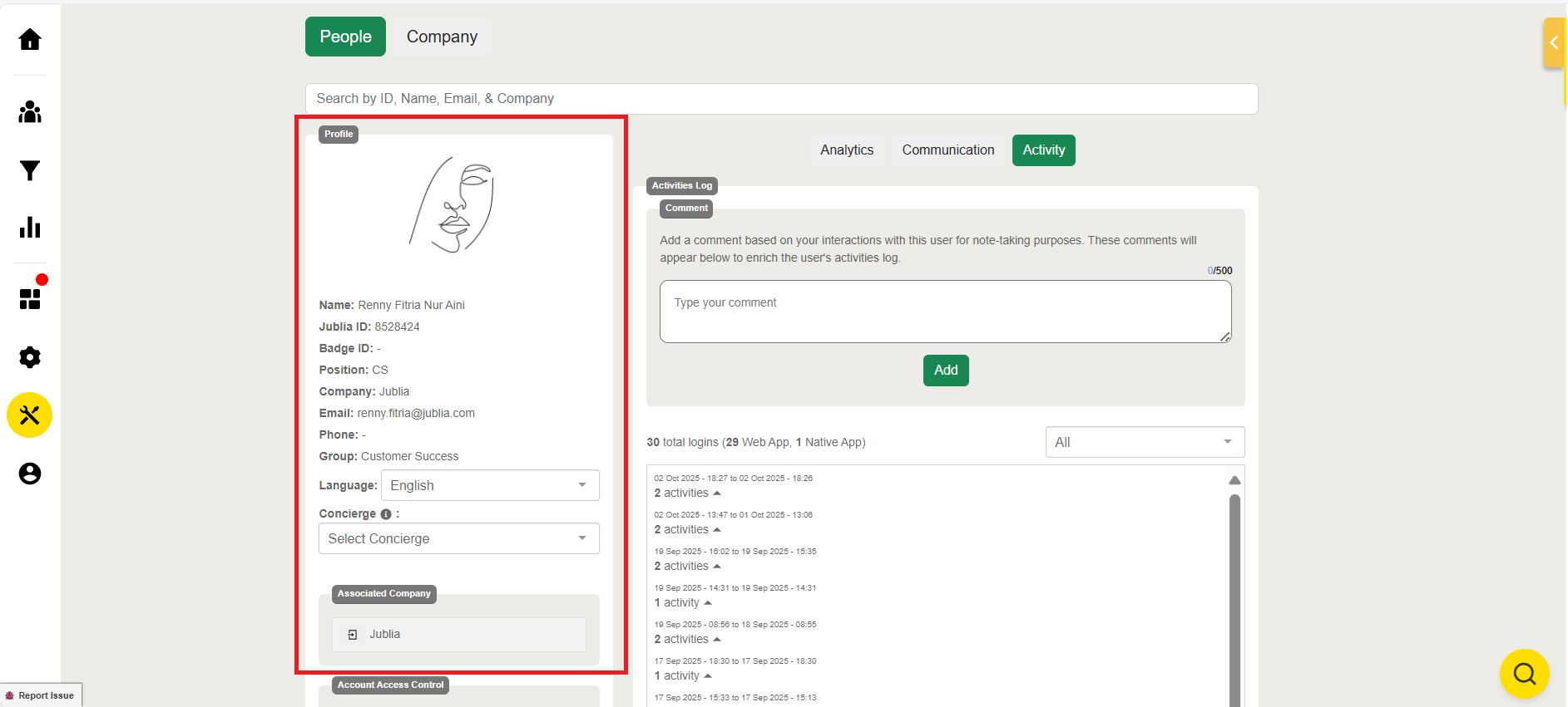 Activity: See a detailed log of an account's activity. It tracks login activity and also serves as a log for notes added by a concierge.