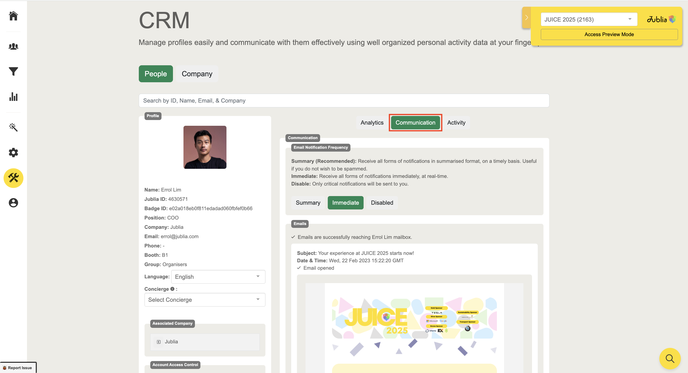 Communication: The communication section allows you to manage an account's notification settings and view their communication history.