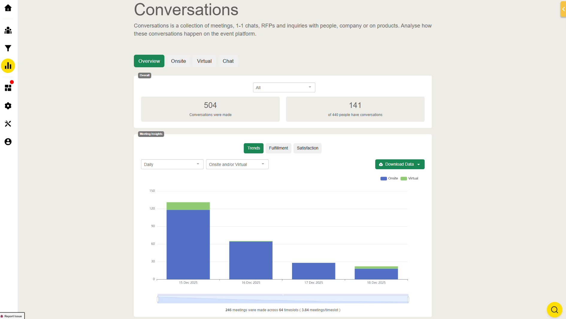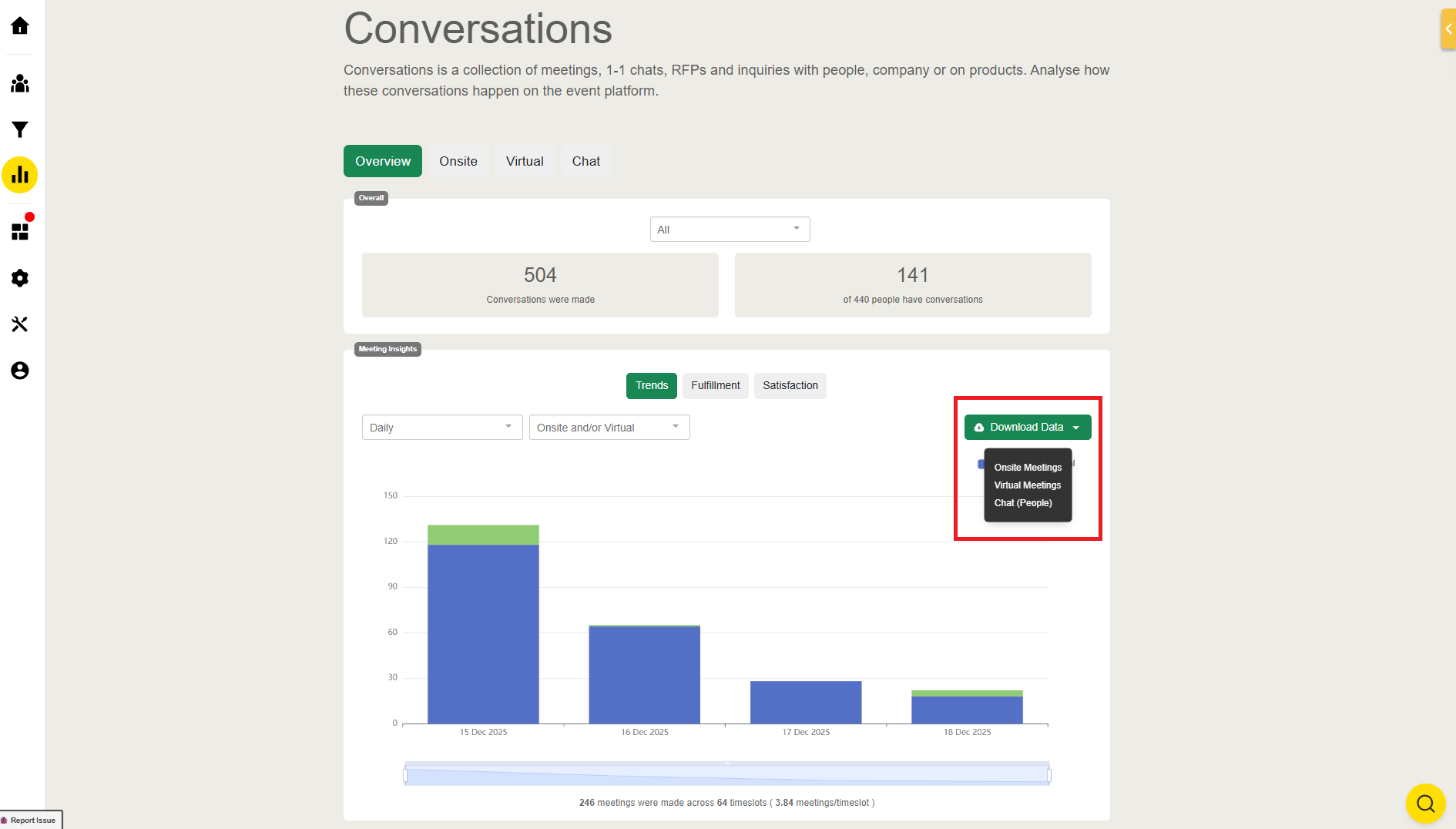 Shows charts detailing the number of meetings in daily and timeslot format