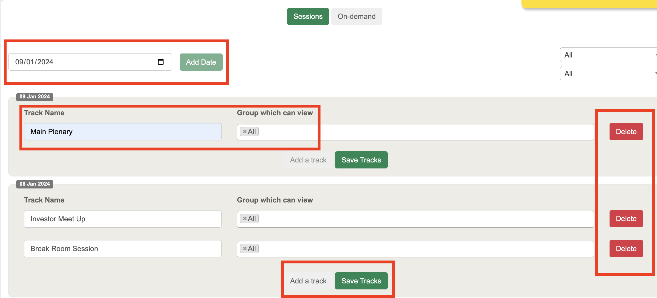 Click 'Add Date' to create a new session track.