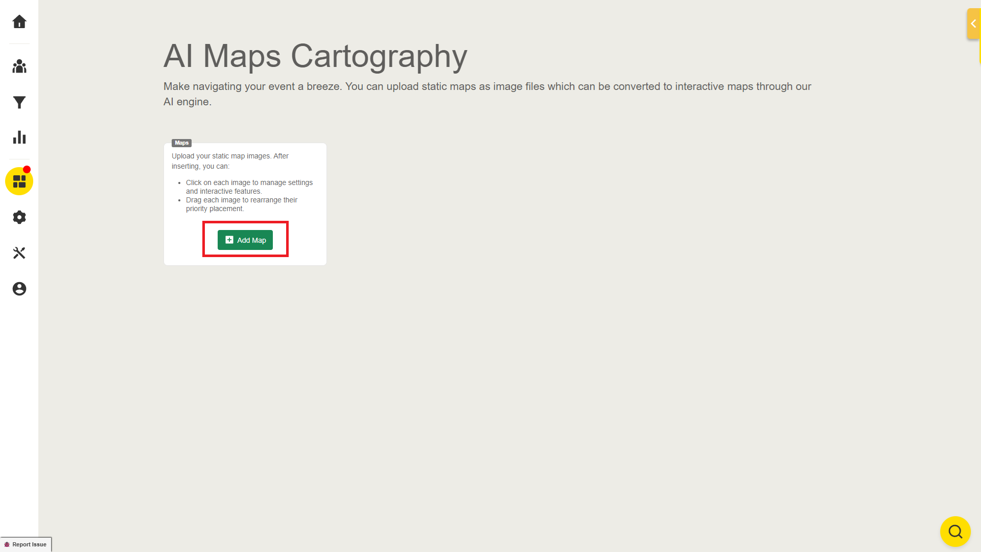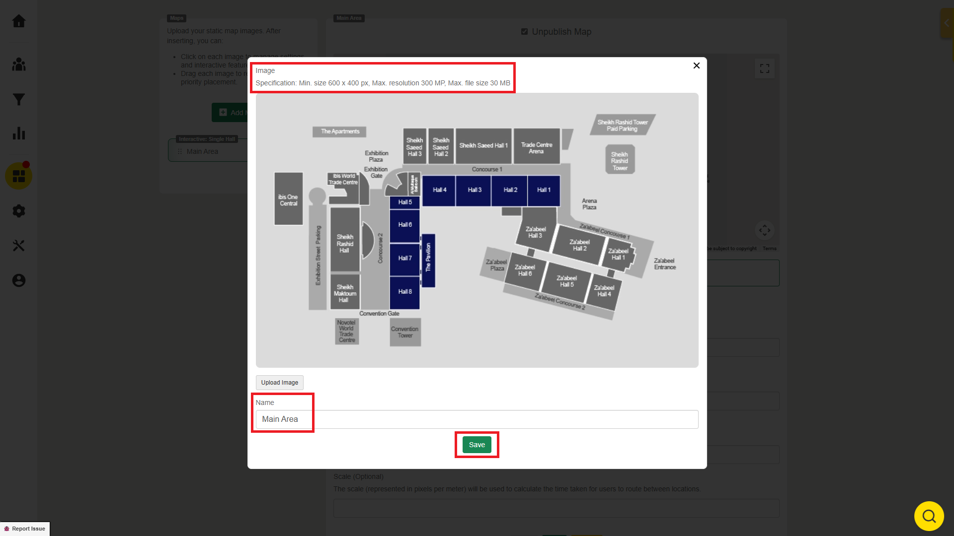 Click the green “Add Map” button to upload the floor plan to the platform. Please upload the image in the format of png, jpg, or jpeg.