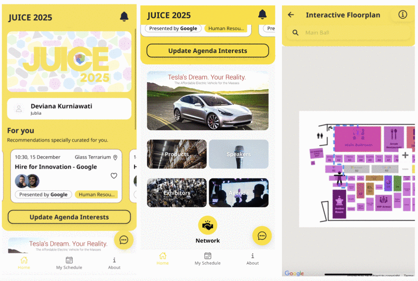 Maps: Explore the onsite floor plan easily by clicking on our Maps feature. You can utilize Maps to find a specific location, to find related agenda happening in a specific location, and to get a direction route from two locations.