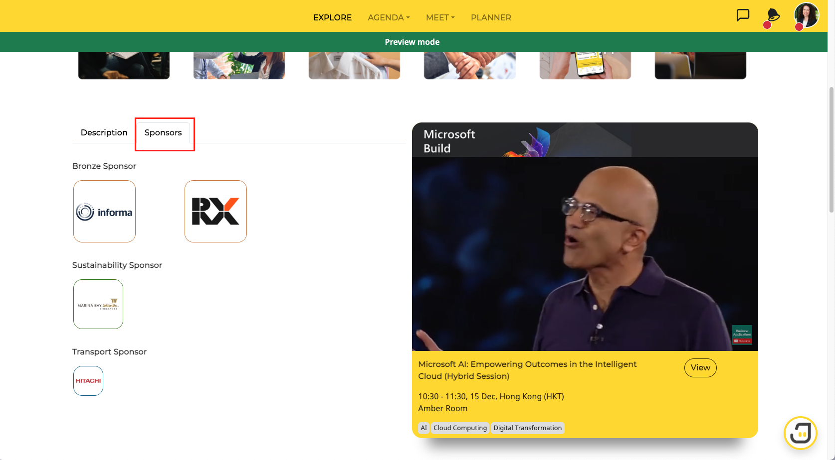 Within the platform, an event can have up to 5 categories of sponsorship to enhance the visibility of participating companies. These tiers, typically categorized as Gold, Silver, and Bronze, determine the priority of company profiles, as well as their associated people and products, within our platform.