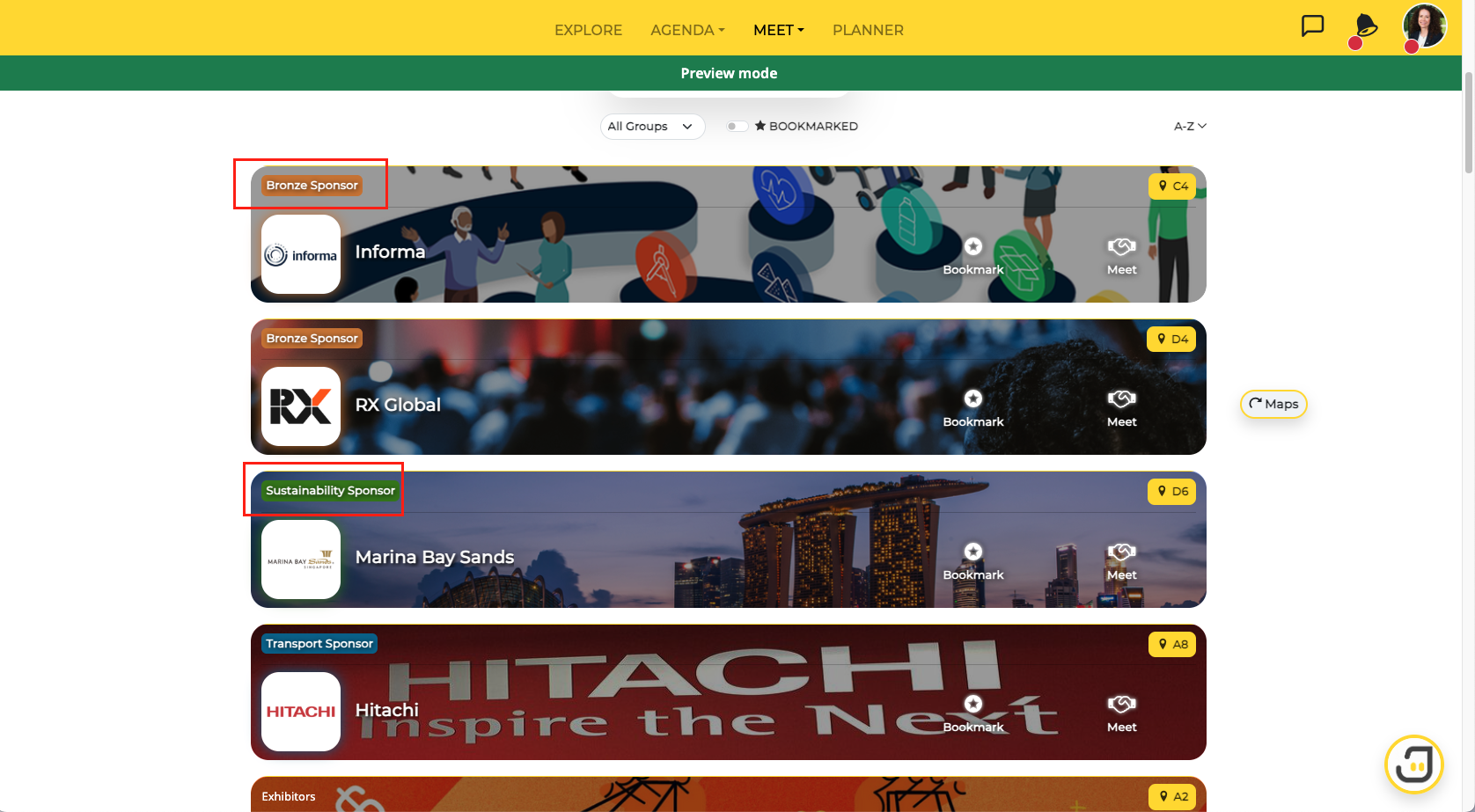 Companies that haven't opted for sponsorship will be marked with their group name (e.g., delegates, buyers) as a tag on their profile cards. These profiles will not have a colored border.