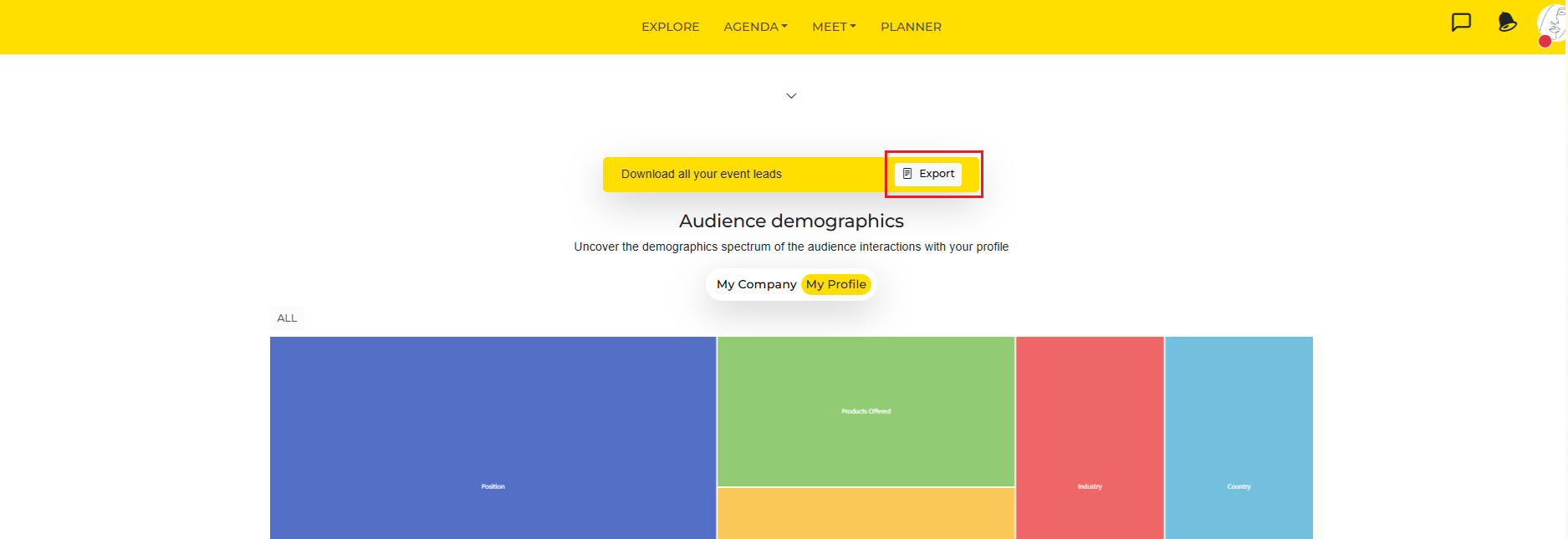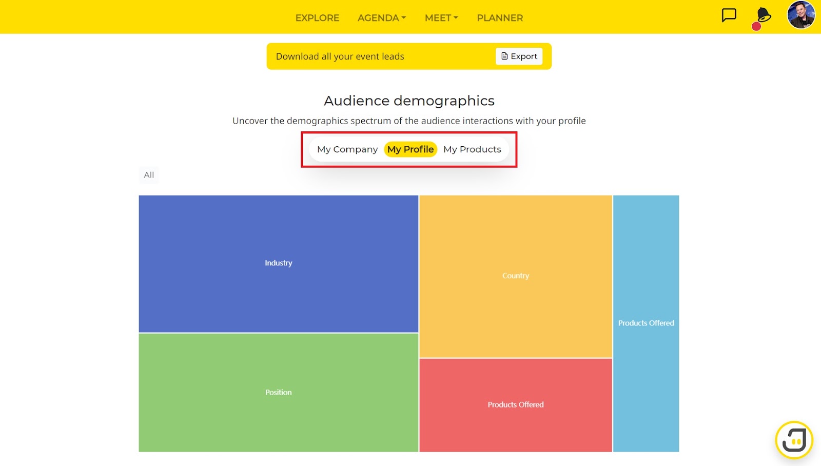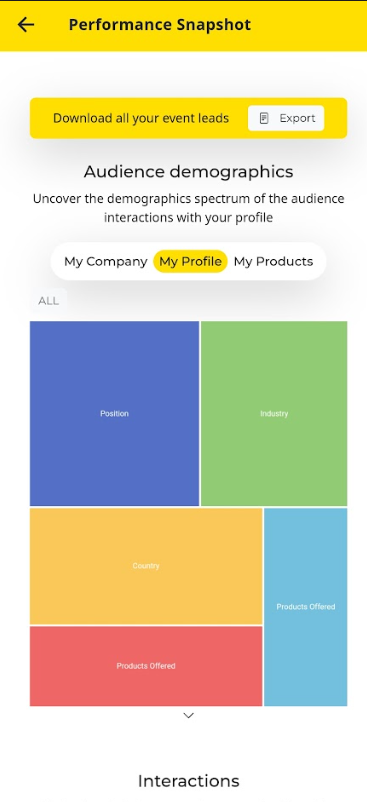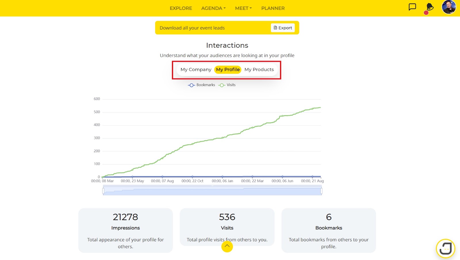 The Interactions graph shows the Impressions, Visits & Bookmarks of other attendees to your profile. See the difference of the Interactions by switching between My Company, My Profile or My Products.