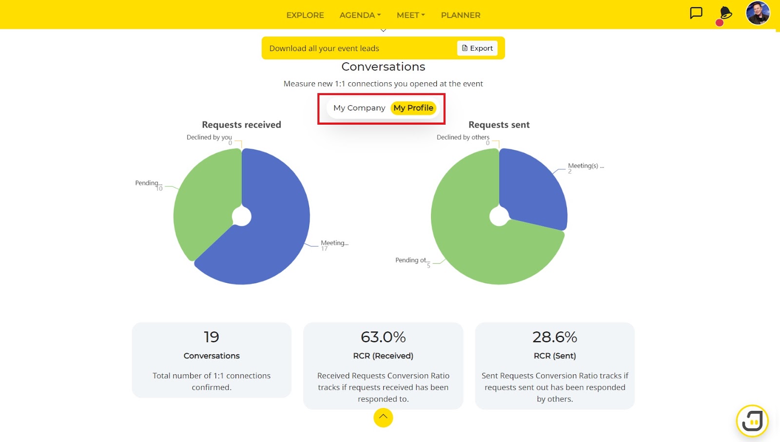 1. Pie charts show a complete picture of your meeting status (successful, pending, and declined requests).