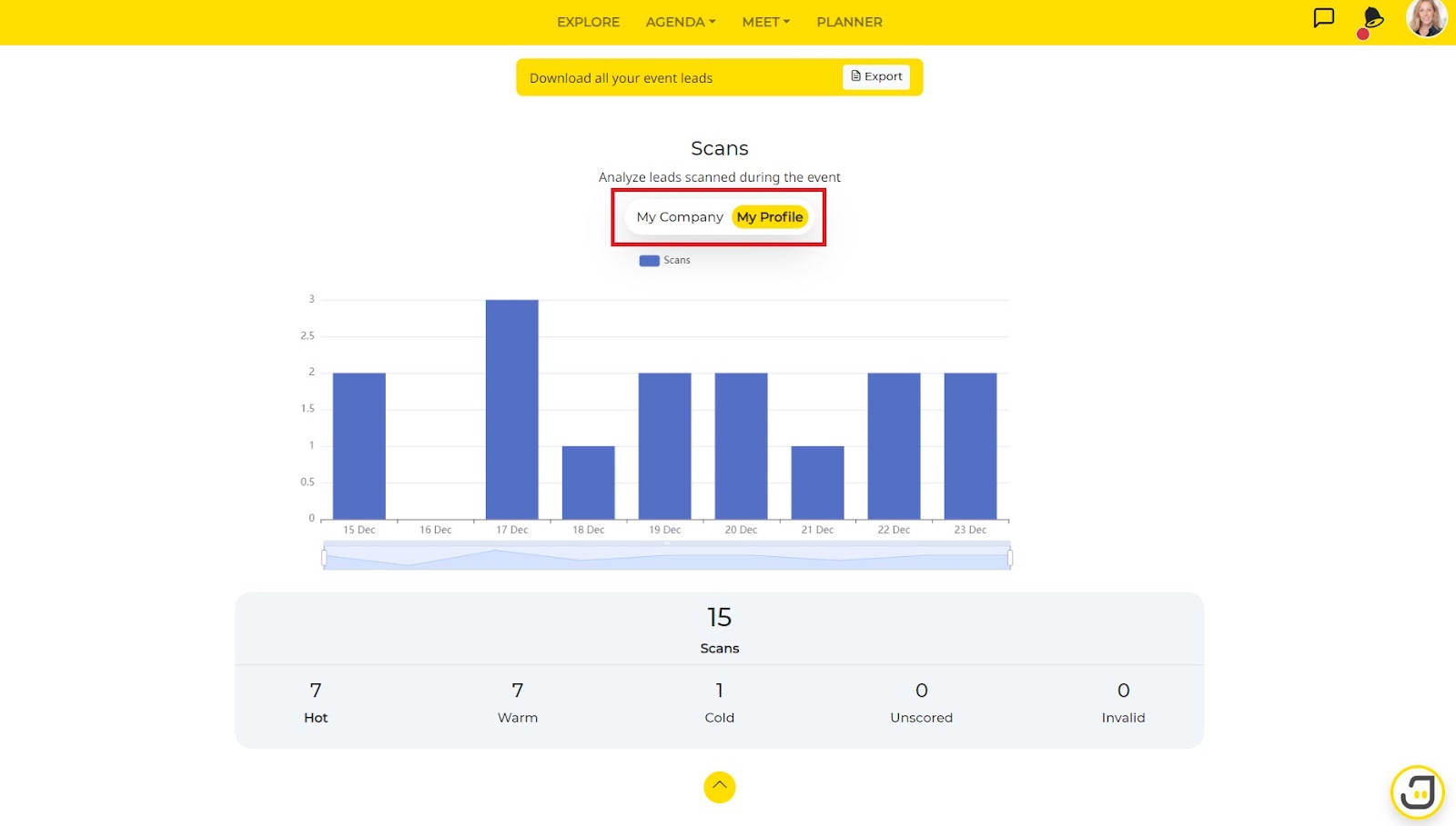 The Scans provide insights into leads captured during the event. Switch between My Company or My Profile to view the leads scanned of your company or your own.